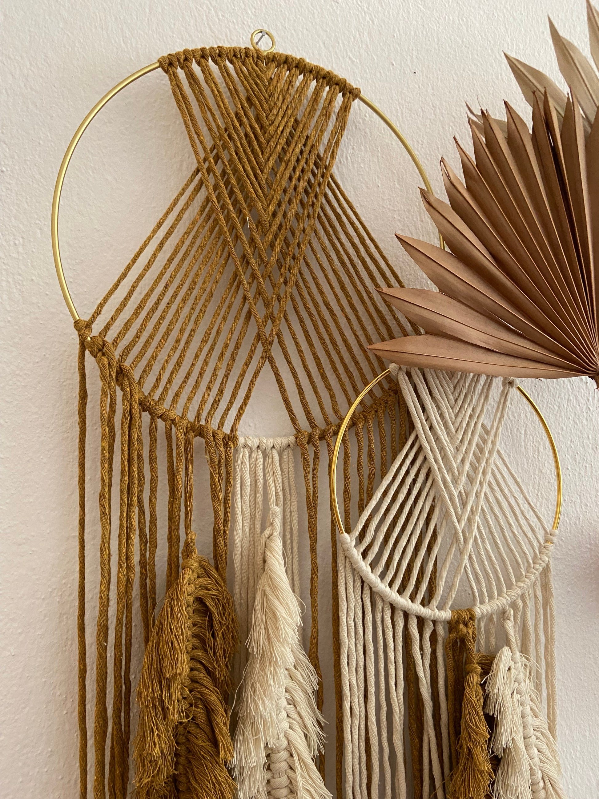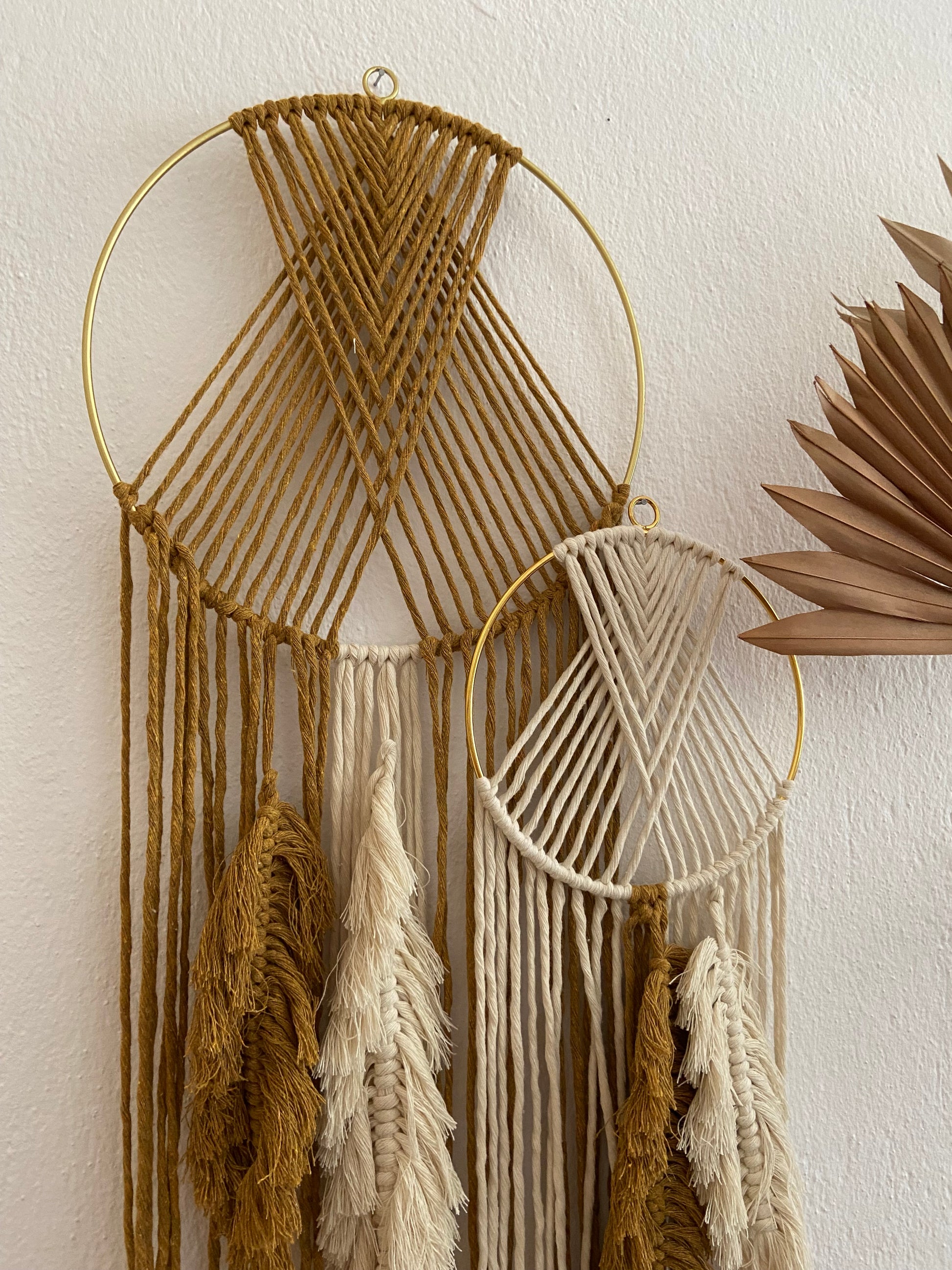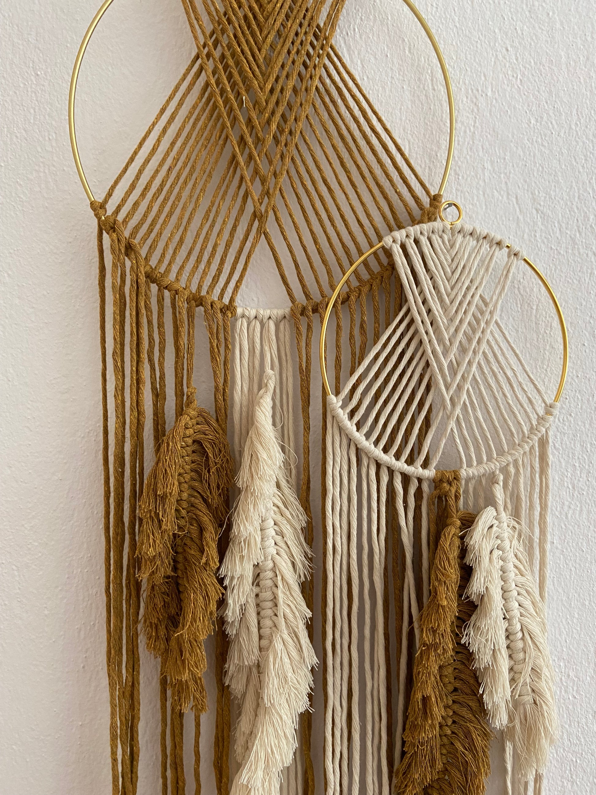 Χειροποίητο, μακραμέ σετ δύο ονειροπαγίδων σε χρυσούς μεταλλικούς κύκλους. Φτιαγμένο από φυσικές ίνες, σε γήινες αποχρώσεις του εκρού και της ώχρας, προσφέρει μια ζεστή και ήρεμη ατμόσφαιρα στο χώρο σας. Τα χειροποίητα μακραμέ φτερά προσθέτουν μια ρομαντική και ονειρεμένη διάσταση, ενώ οι λεπτές μακριές κλωστές που τα πλαισιώνουν, δημιουργούν μία αίσθηση κίνησης και ελαφρότητας. Αυτό το χειροποίητο μακραμέ σετ συνδυάζει τέχνη και φυσικότητα, μεταμορφώνοντας τον τοίχο σας σε ένα έργο τέχνης.