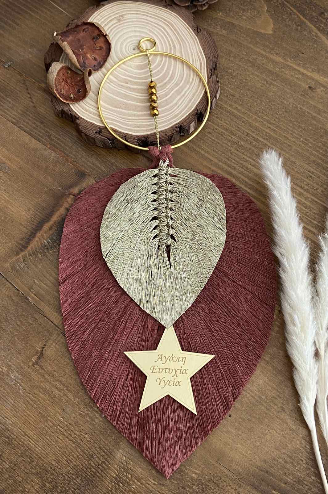 Χειροποίητο μακραμέ διακοσμητικό με δύο φύλλα σε αποχρώσεις μπορντό και χρυσού, κρεμασμένο σε χρυσό μεταλλικό κρίκο που στολίζεται με διακοσμητικές χάντρες. Στο τελείωμα, ένα χρυσό αστέρι χαραγμένο με ευχές "Αγάπη, Ευτυχία, Υγεία" ολοκληρώνει την κατασκευή, προσφέροντας μία κομψή και ζεστή νότα σε κάθε χώρο. Ιδανικό για δώρο ή για να ανανεώσετε τη διακόσμηση του σπιτιού σας.