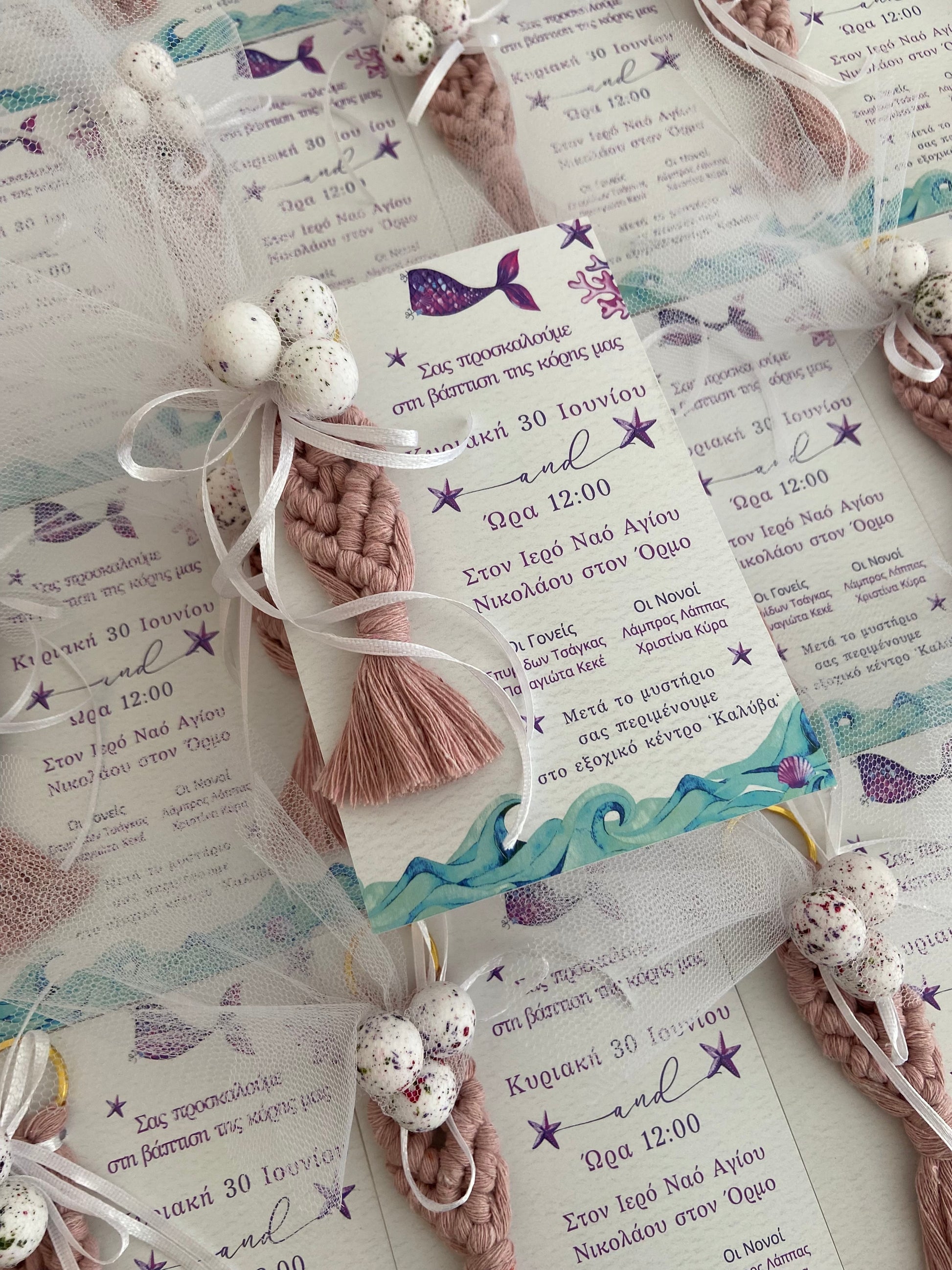 Η τιμή περιλαμβάνει το μακραμέ μπρελόκ μήκους 12 εκατοστών στο χρώμα της αρεσκείας σας, 3 κουφέτα crispy Χατζηγιαννάκη και το προσκλητήριο το οποίο σχεδιάζουμε σύμφωνα με τις επιθυμίες σας.