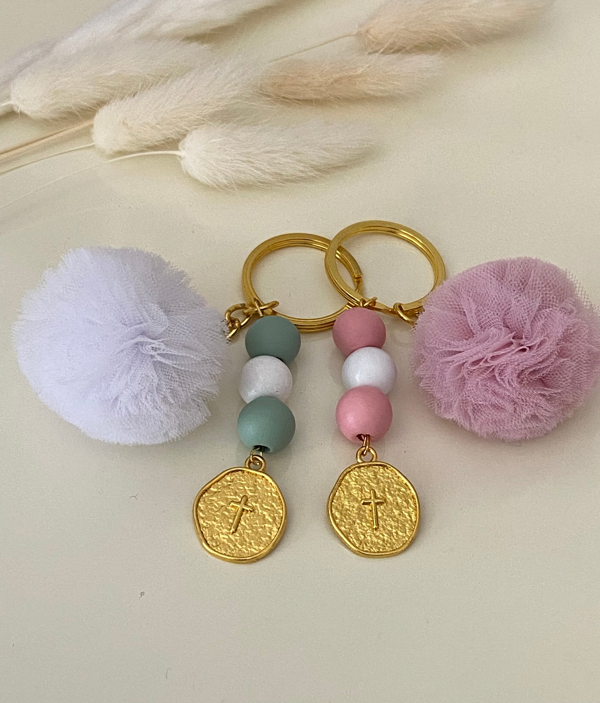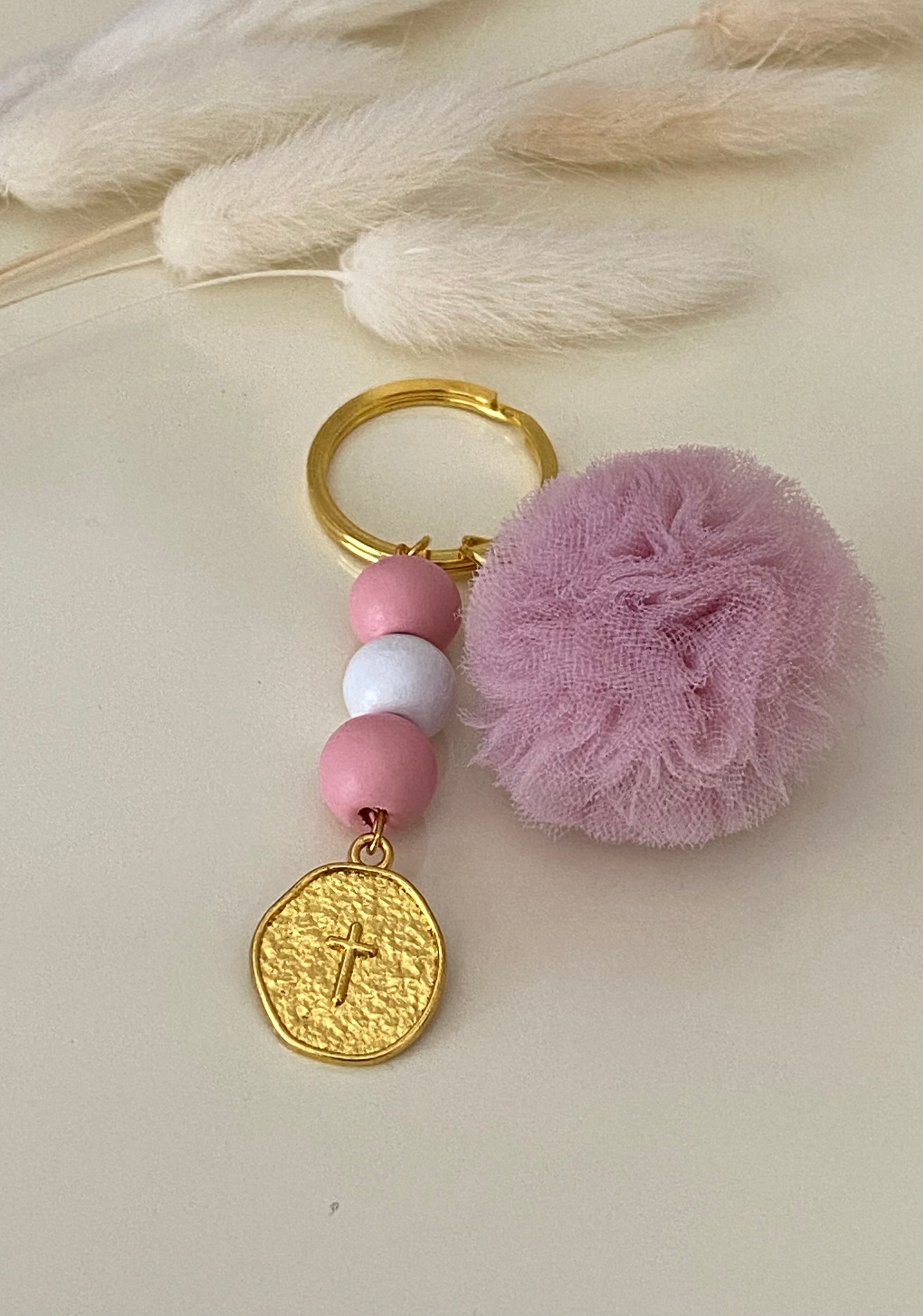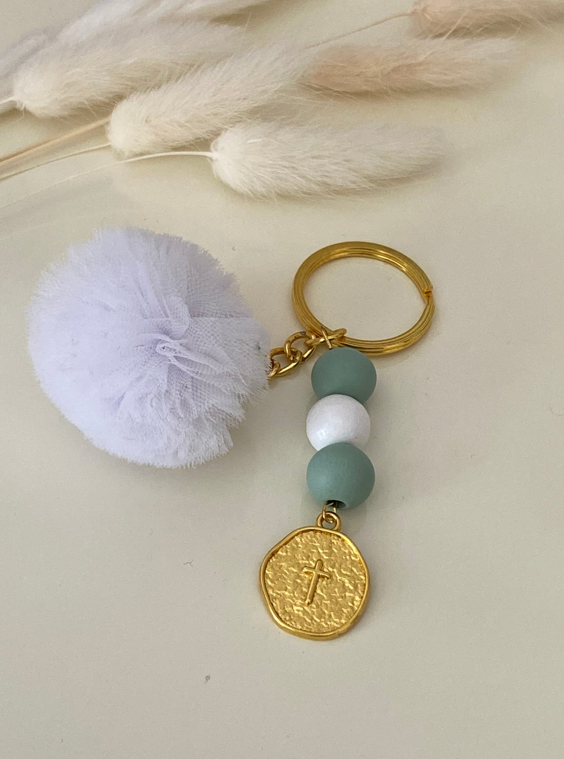Διπλό μαρτυρικό μπρελόκ με ξύλινες χάντρες, Κωνσταντινάτο και στην αλυσίδα ένα υπέροχο πον-πον.