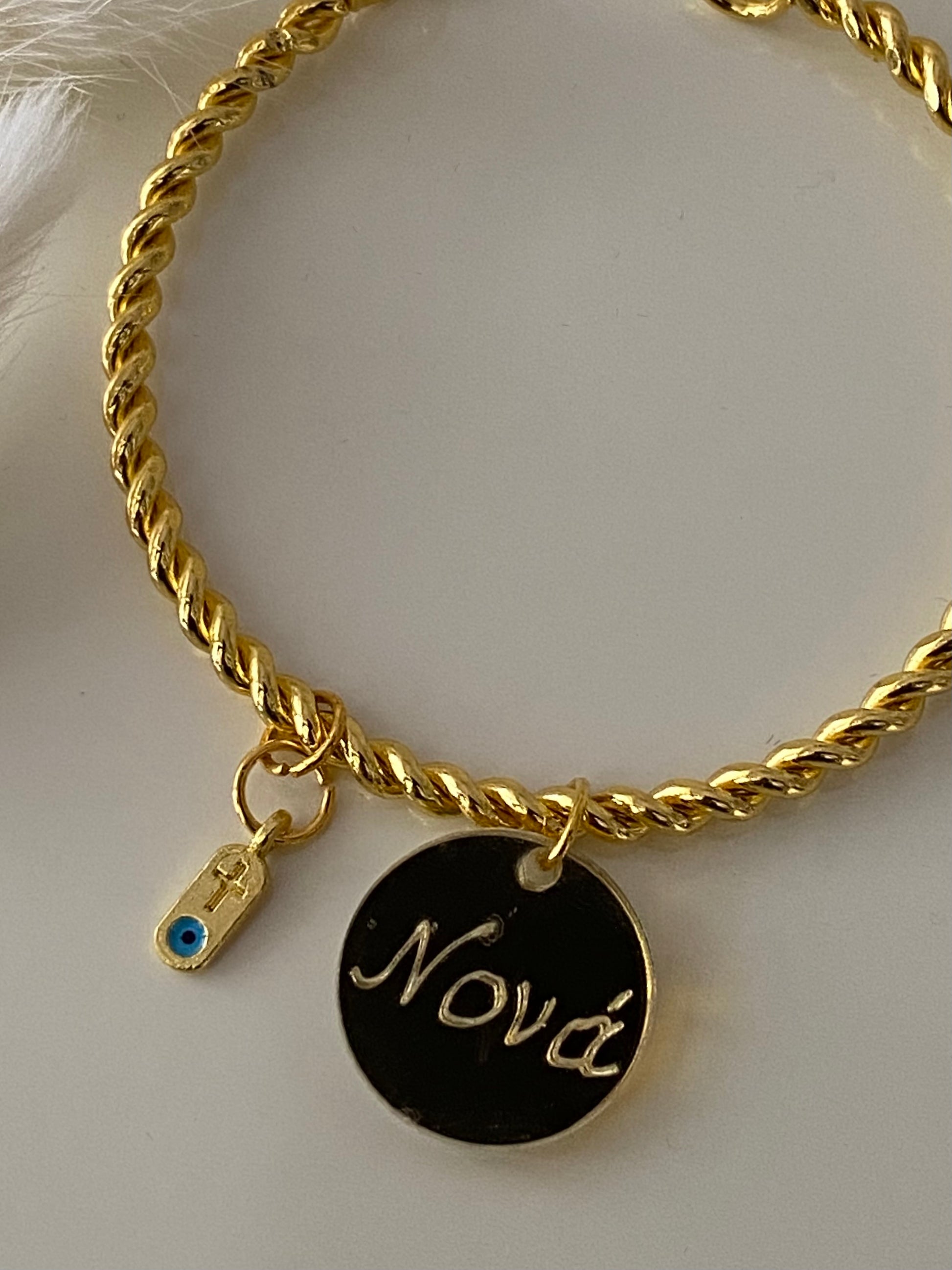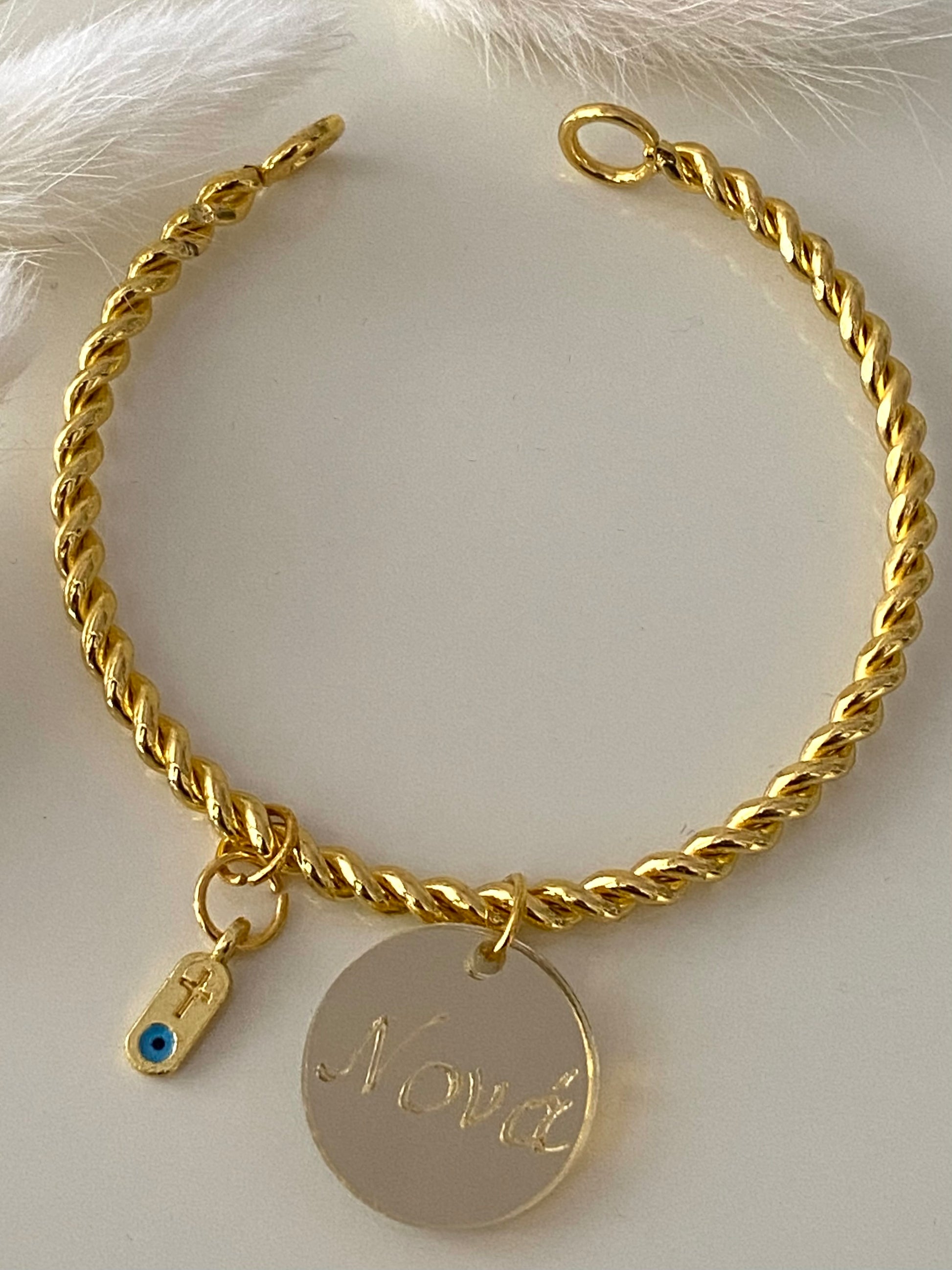 Μαρτυρικό βραχιόλι βάπτισης σε χρυσό χρώμα με βάση μεταλλική σπειροειδής βέργα με κούμπωμα σε χρυσό χρώμα. Διαθέτει ένα χρυσό σταυρουδάκι με ματάκι, ταμπελάκι με εφέ καθρέπτη.