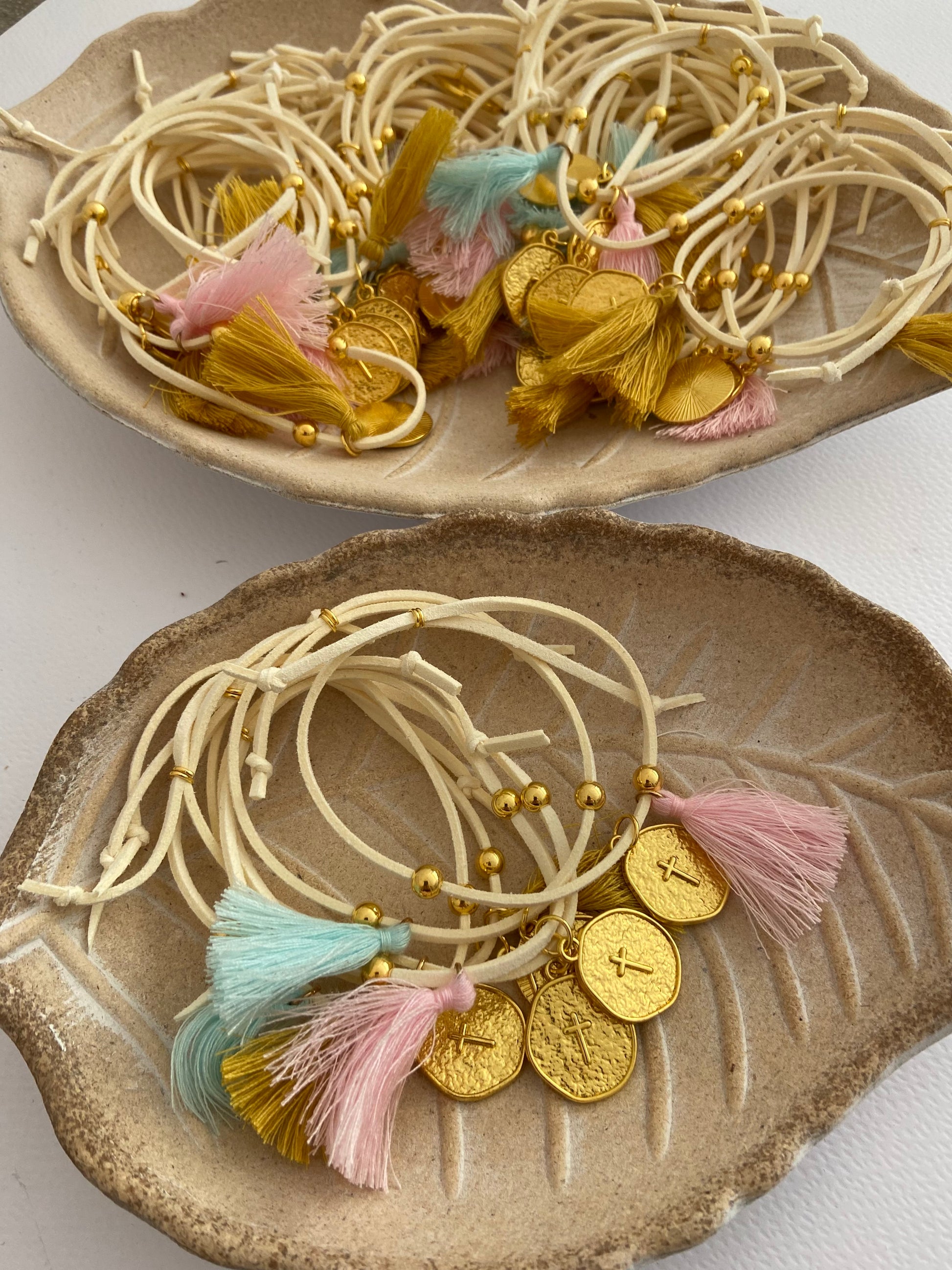 Mαρτυρικό βραχιόλι από λεπτό δέρμα με σταυρό σε φλουρί, χρυσά μεταλλικά στοιχεία και φουντίτσες σε διάφορα χρώματα.