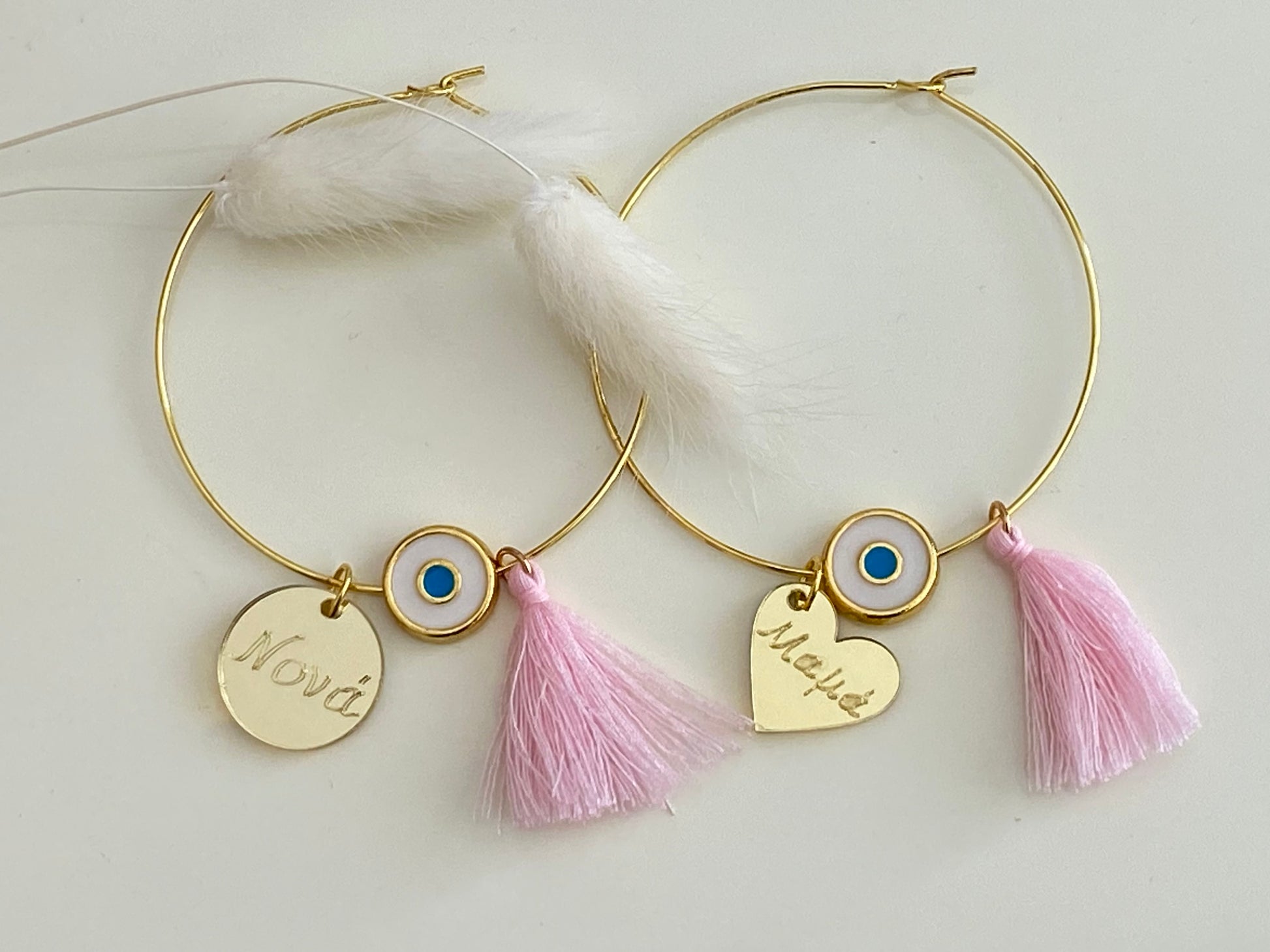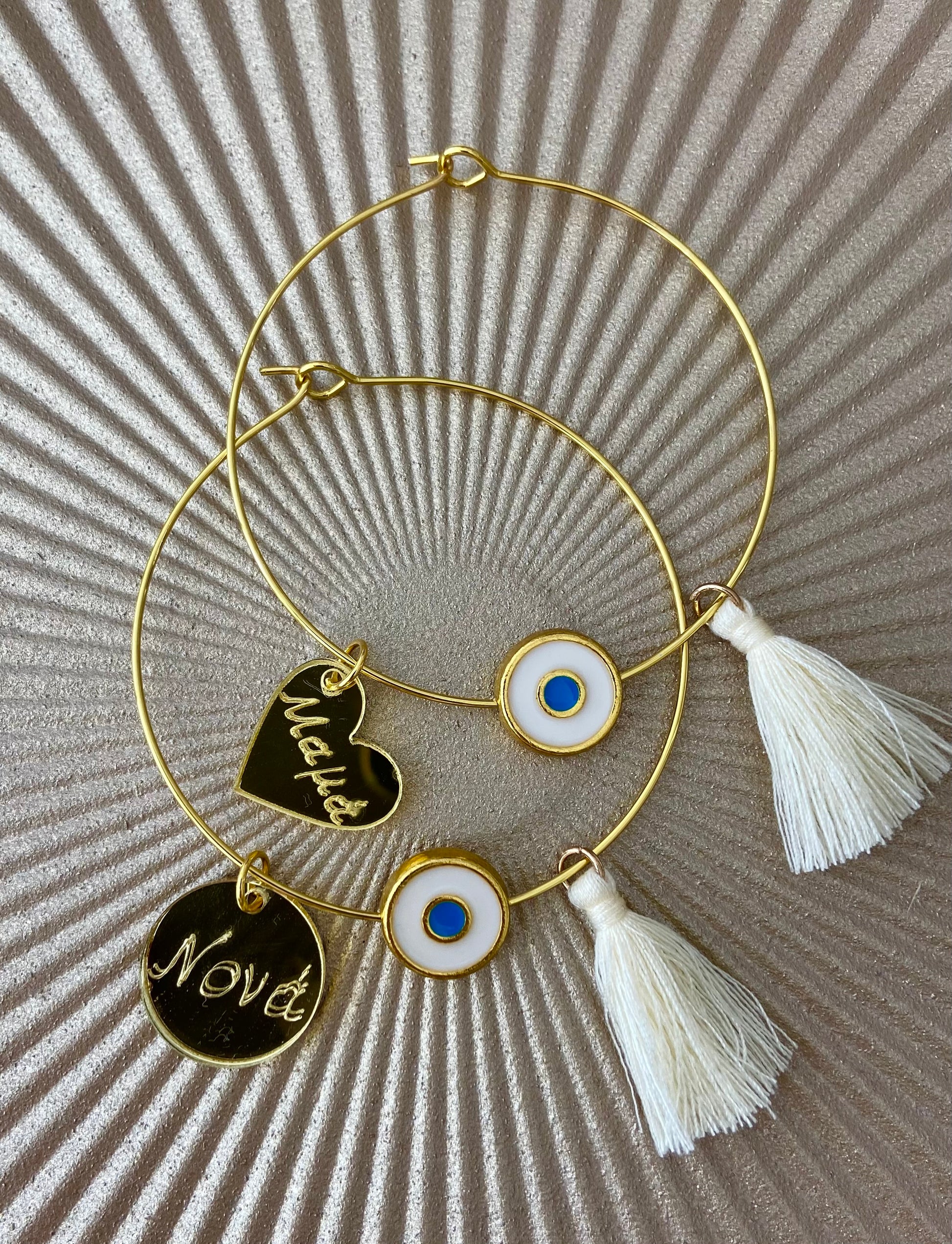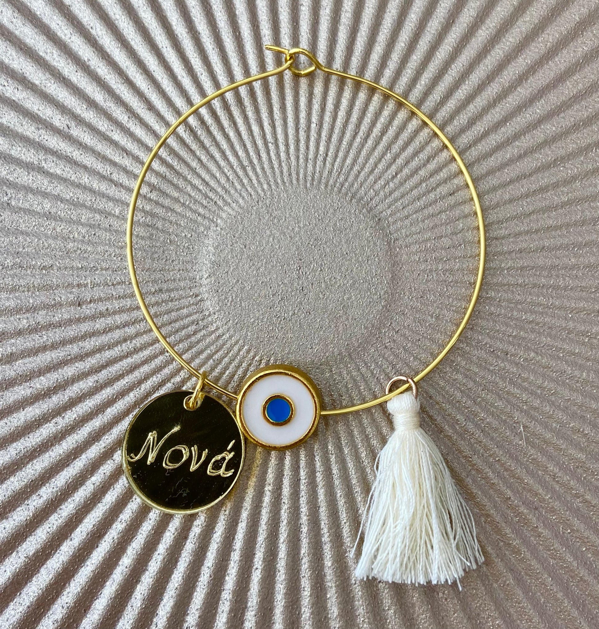 Κομψή μεταλλική βέργα σε χρυσό χρώμα με ματάκι και φουντίτσα στο χρώμα της επιλογής σας. Αυτό που το κάνει μοναδικό και ιδιαίτερο είναι οι γλυκιές λέξεις "Μαμά" "Νονά" 'Γιαγιά' 'Θεία' χαραγμένες σε χρυσό plexiglass.