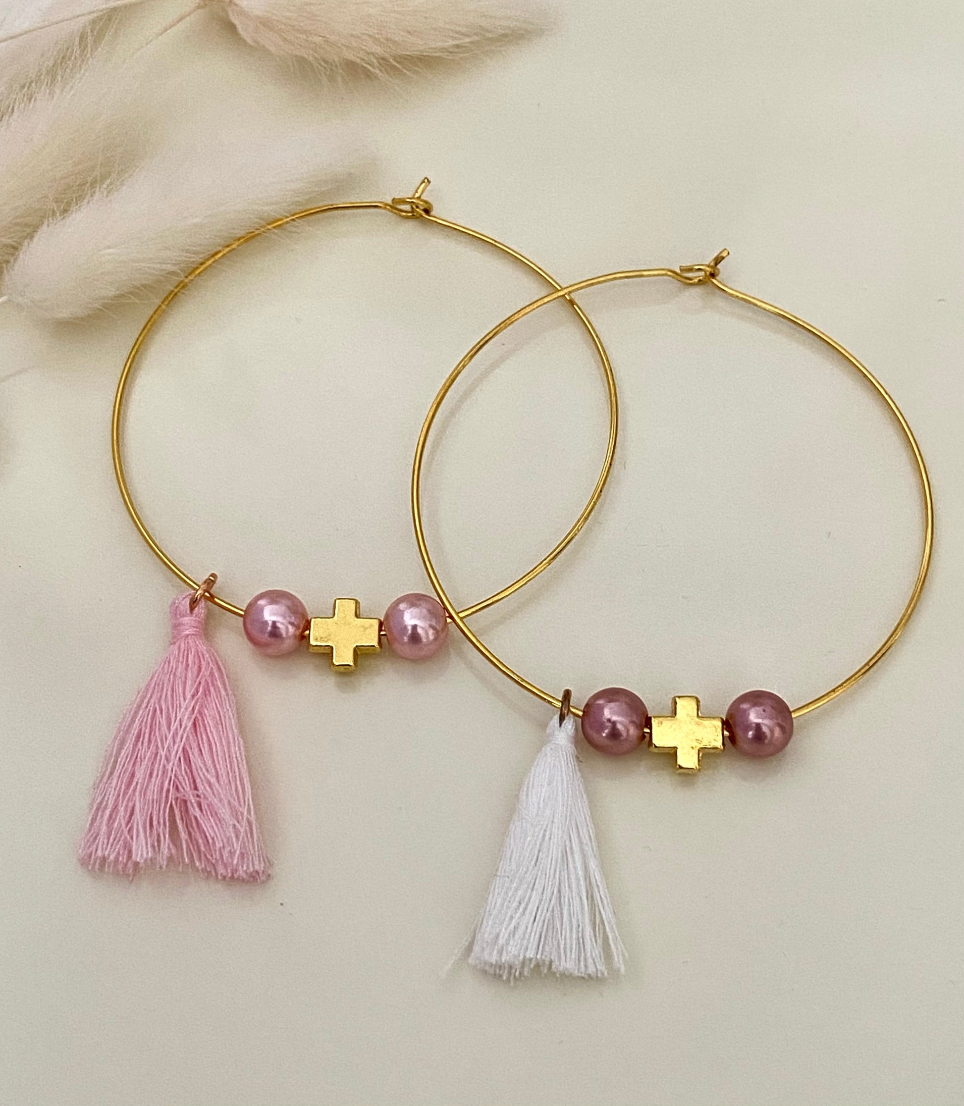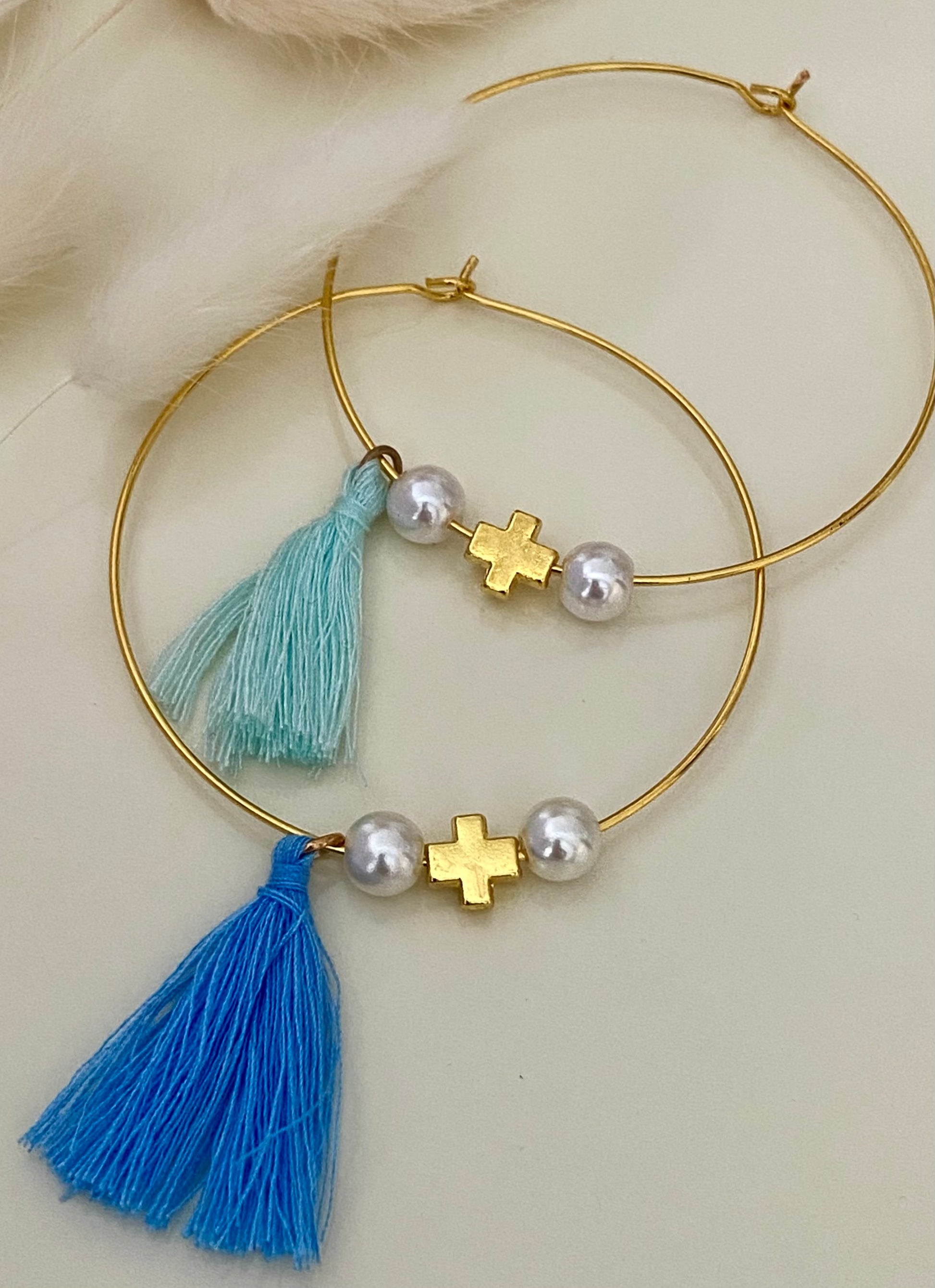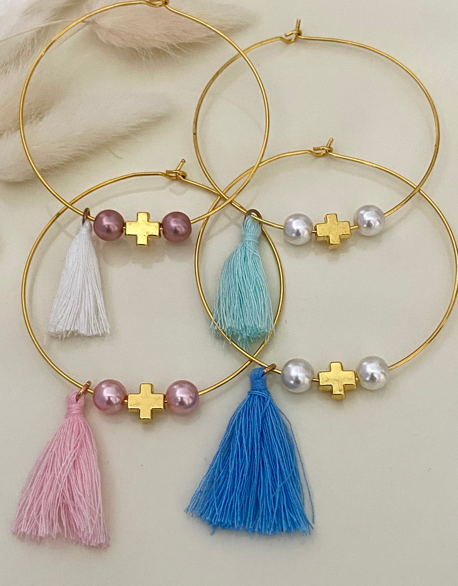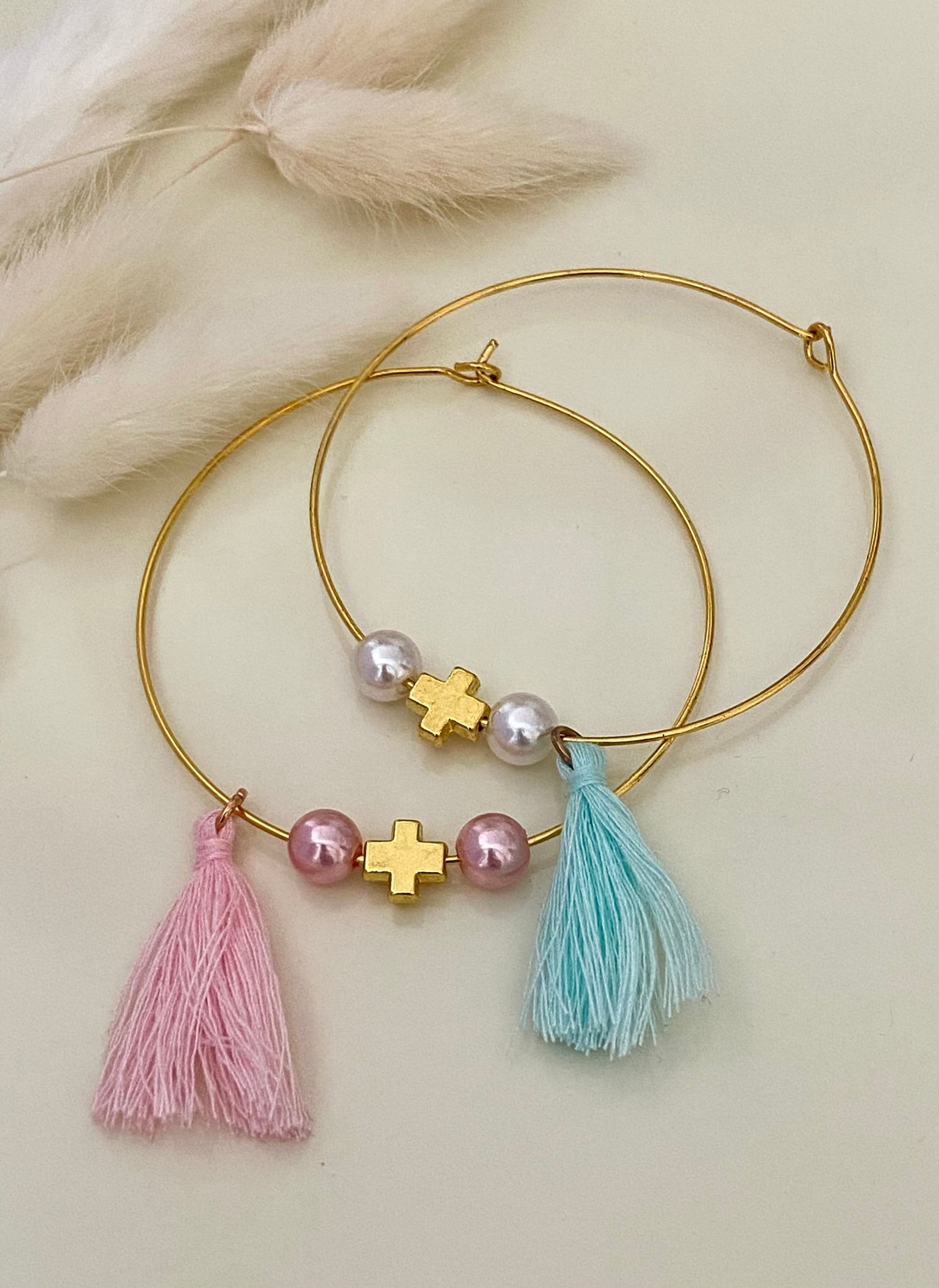 Μαρτυρικό βραχιόλι βάπτισης, μεταλλική λεπτή βέργα με σταυρουδάκι, πέρλες και φουντίτσα στο χρώμα της επιλογής σας.