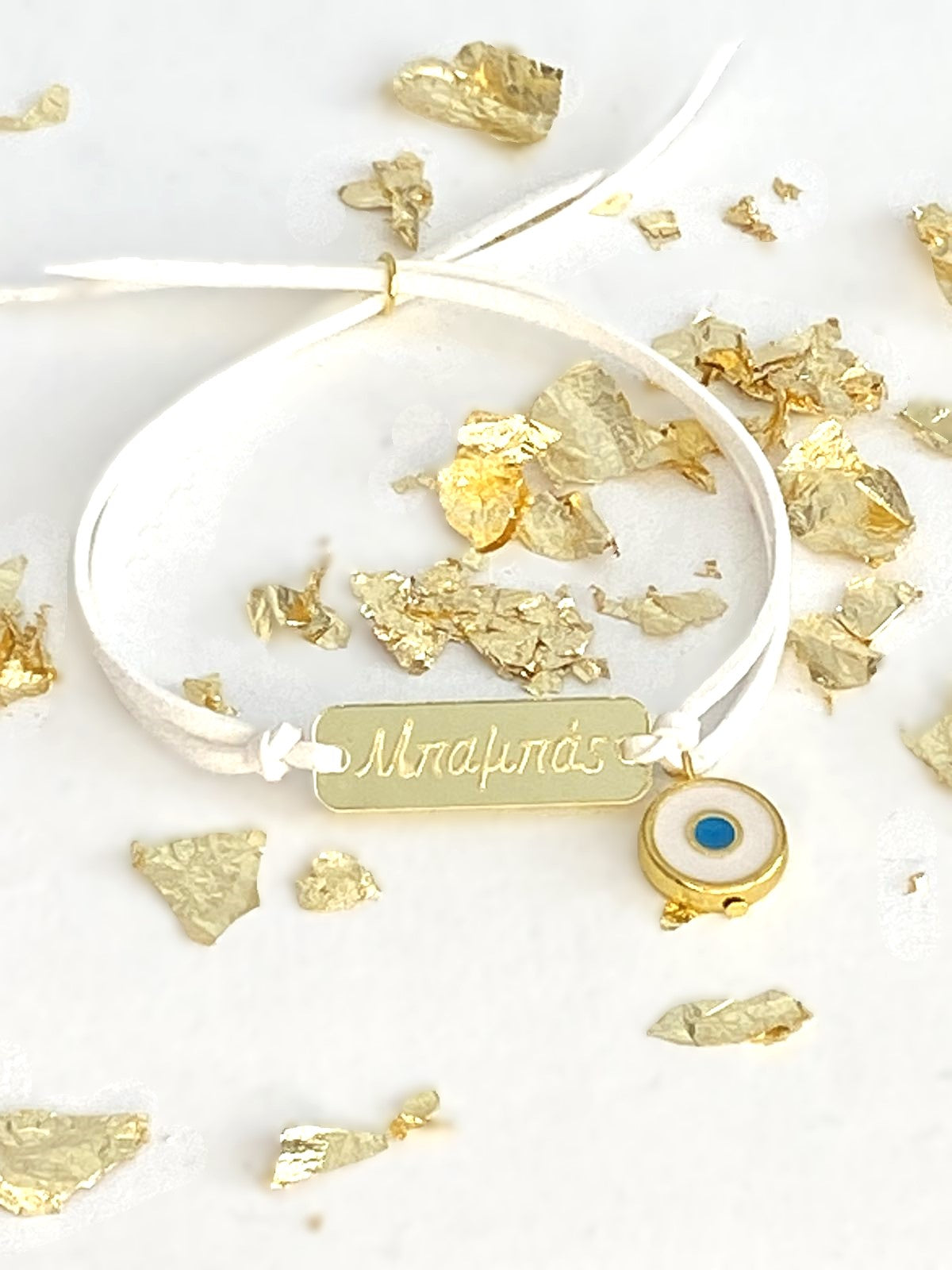 Ανακαλύψτε τη διακριτική κομψότητα με το μαρτυρικό βραχιόλι βάπτισης με βάση λευκό δέρμα. Το χρυσό ματάκι κοσμεί το βραχιόλι και συμβολίζει την προστασία και την τύχη, όπως επίσης και το πλεξιγκλάς με το 'Μπαμπάς' προσδίδει προσωπικό χαρακτήρα.