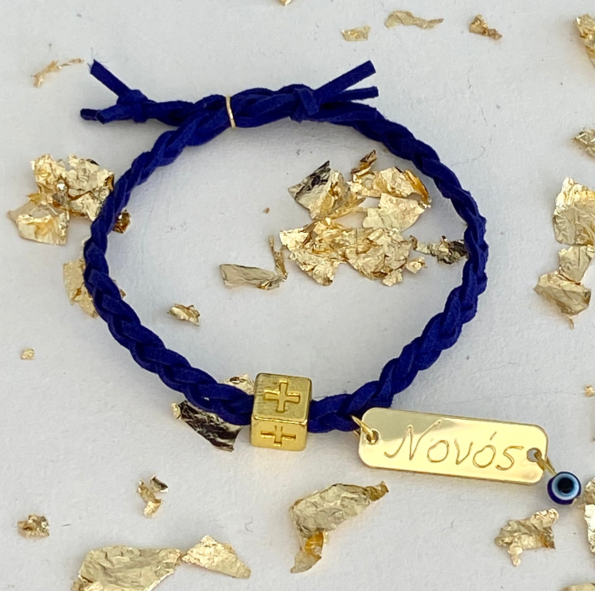 Η νέα μας συλλογή χειροποίητων μαρτυρικών συνδυάζει το αισθητικό κομψό στυλ με την αυθεντική ποιότητα. Βραχιόλι πλεξούδα από μπλε δέρμα και διακοσμημένο με επιβλητικό χρυσό μεταλλικό σταυρό σε κύβο. Είναι ιδιαίτερα ξεχωριστό, όπως ξεχωριστός είναι ο "μπαμπάς" και ο "νονός" την ημέρα της βάφτισης.