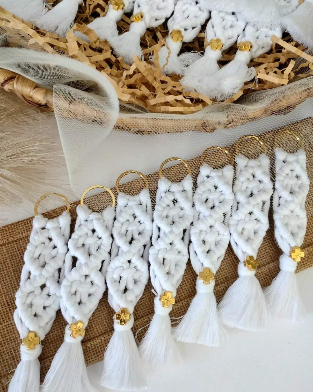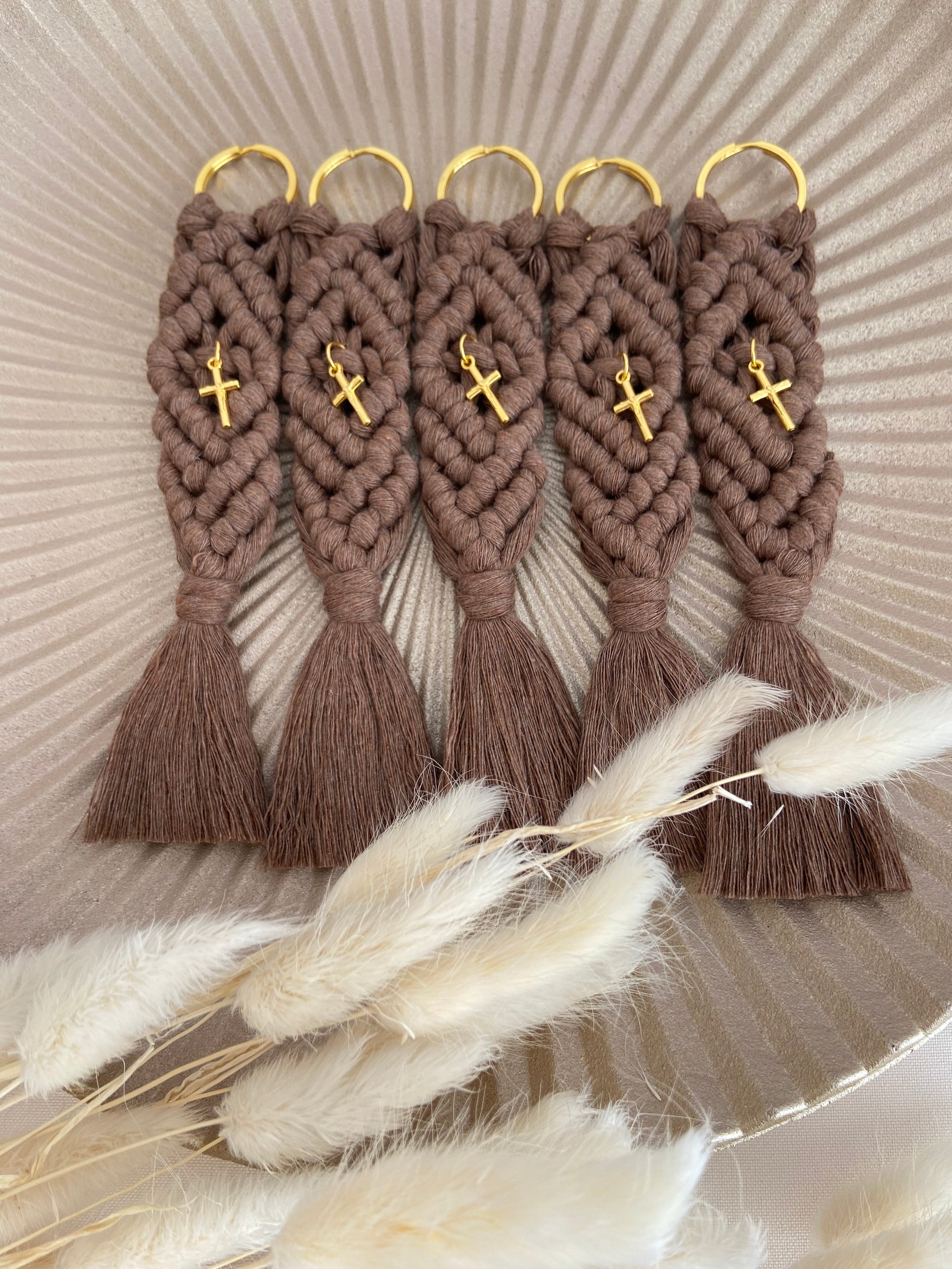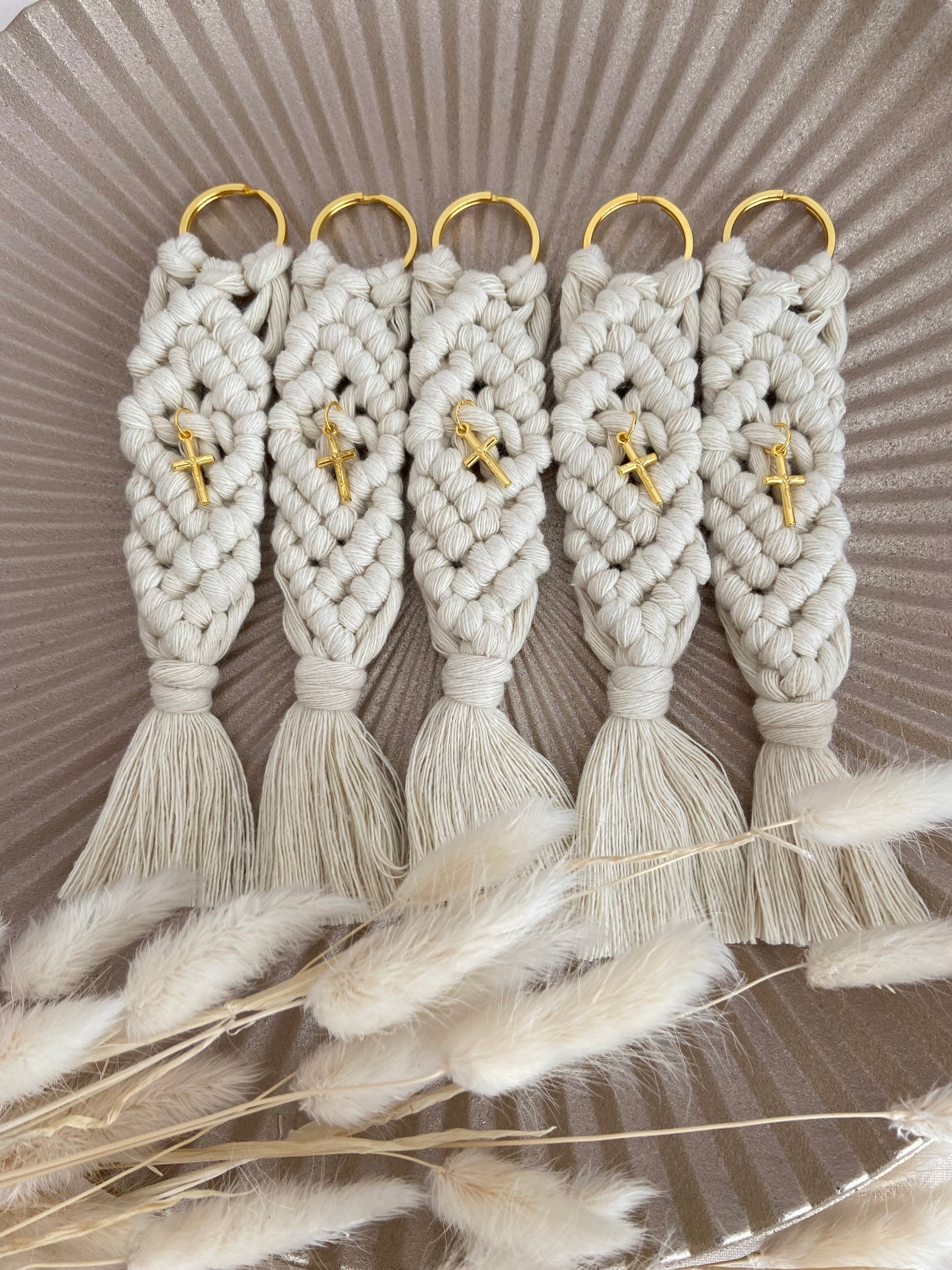 Χειροποίητη μπομπονιέρα μπρελόκ μήκους 16 εκατοστών φτιαγμένο με την τεχνική του μακραμέ. Το χρυσό μεταλλικό σταυρουδάκι δίνει μία διακριτική λάμψη στην μπομπονιέρα σας.