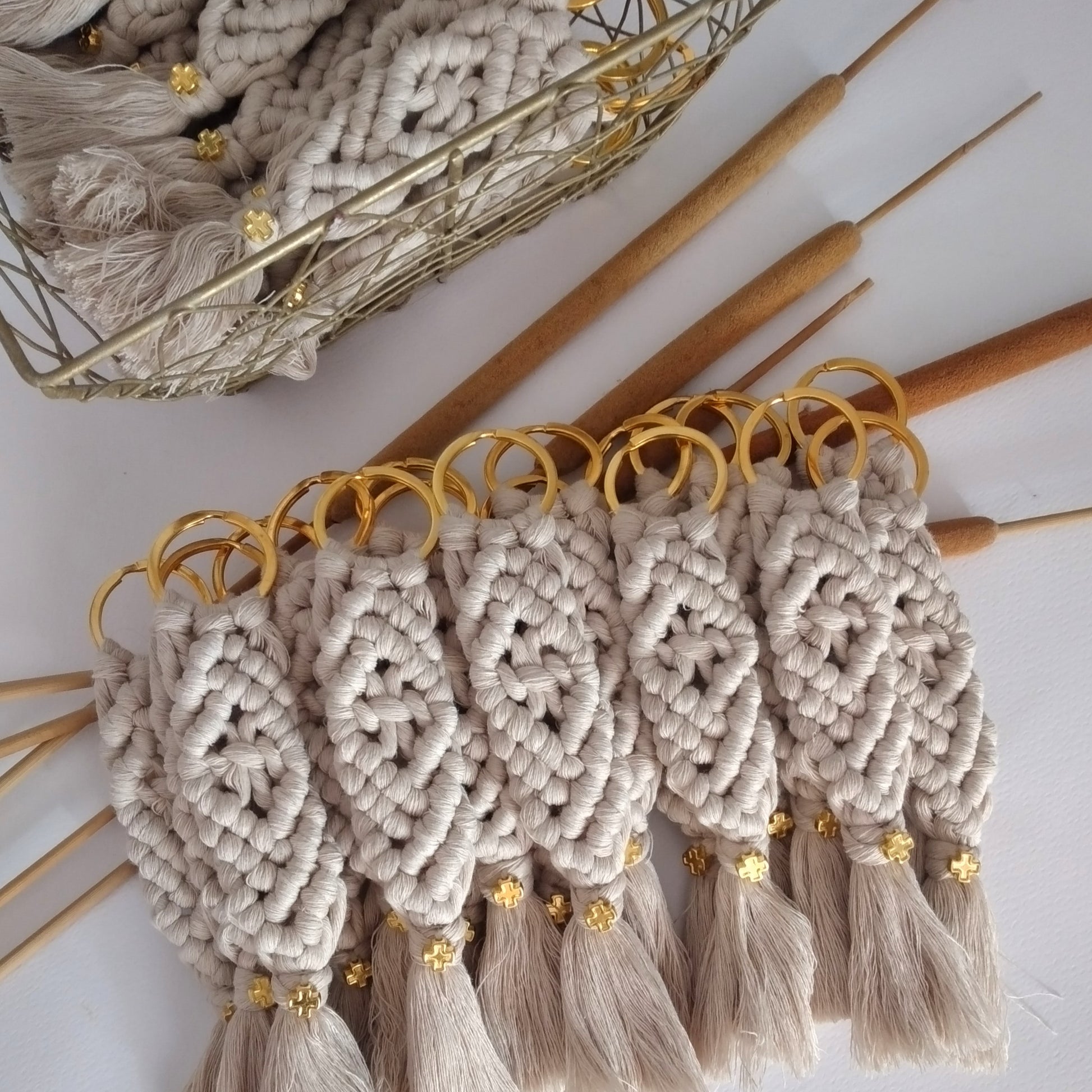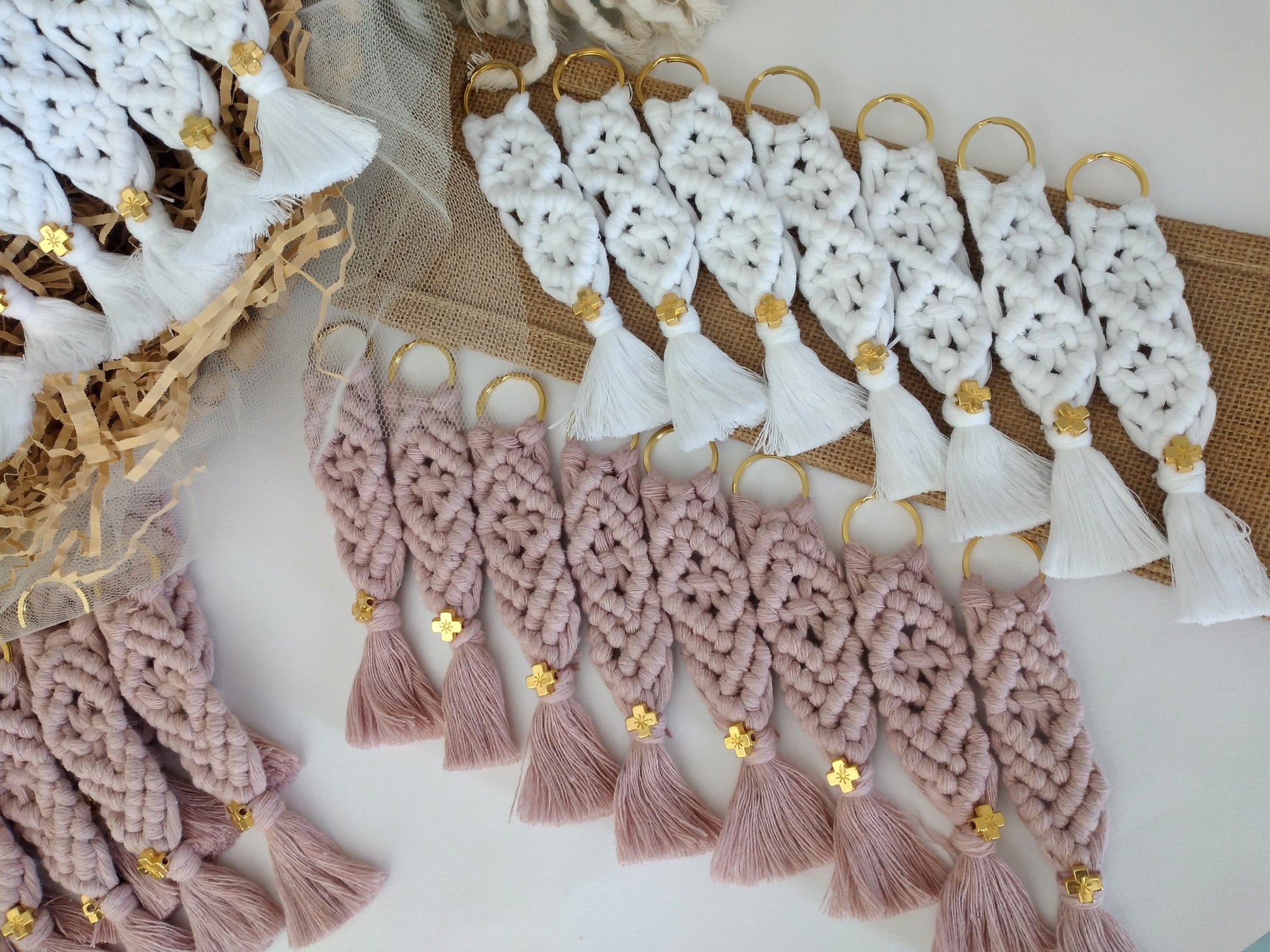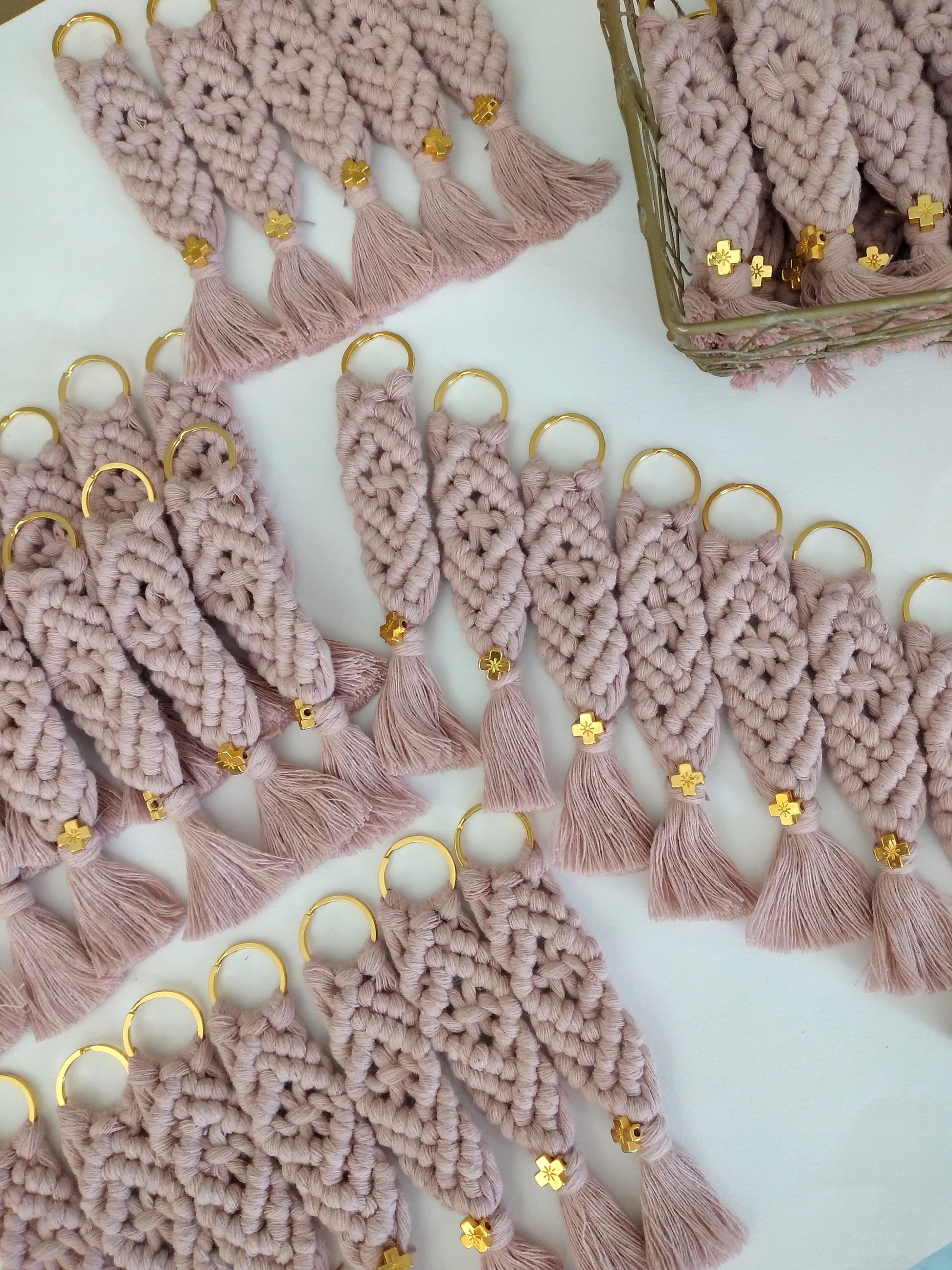 Χειροποίητη μπομπονιέρα μπρελόκ μήκους 16 εκατοστών φτιαγμένο με την τεχνική του μακραμέ. Το χρυσό μεταλλικό σταυρουδάκι δίνει μία διακριτική λάμψη στην μπομπονιέρα σας.