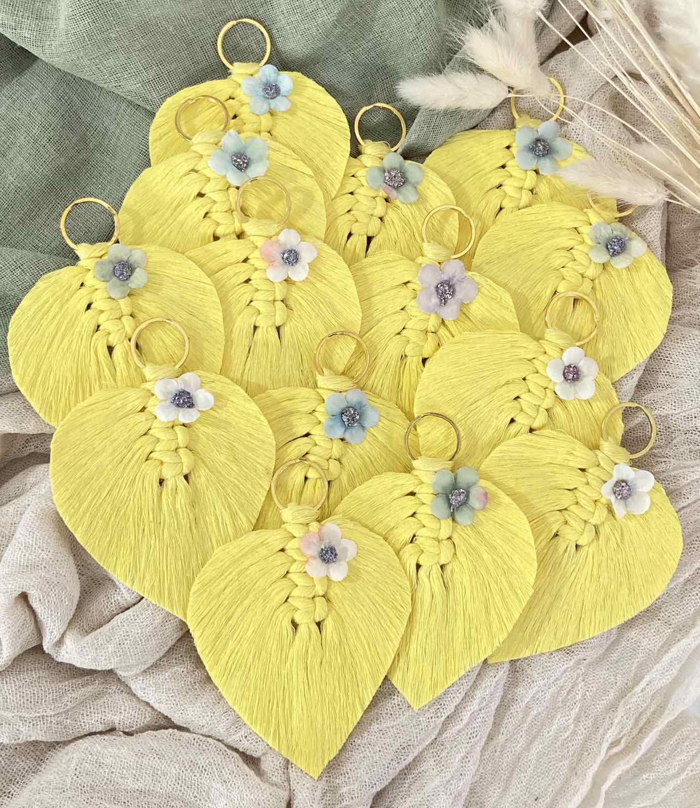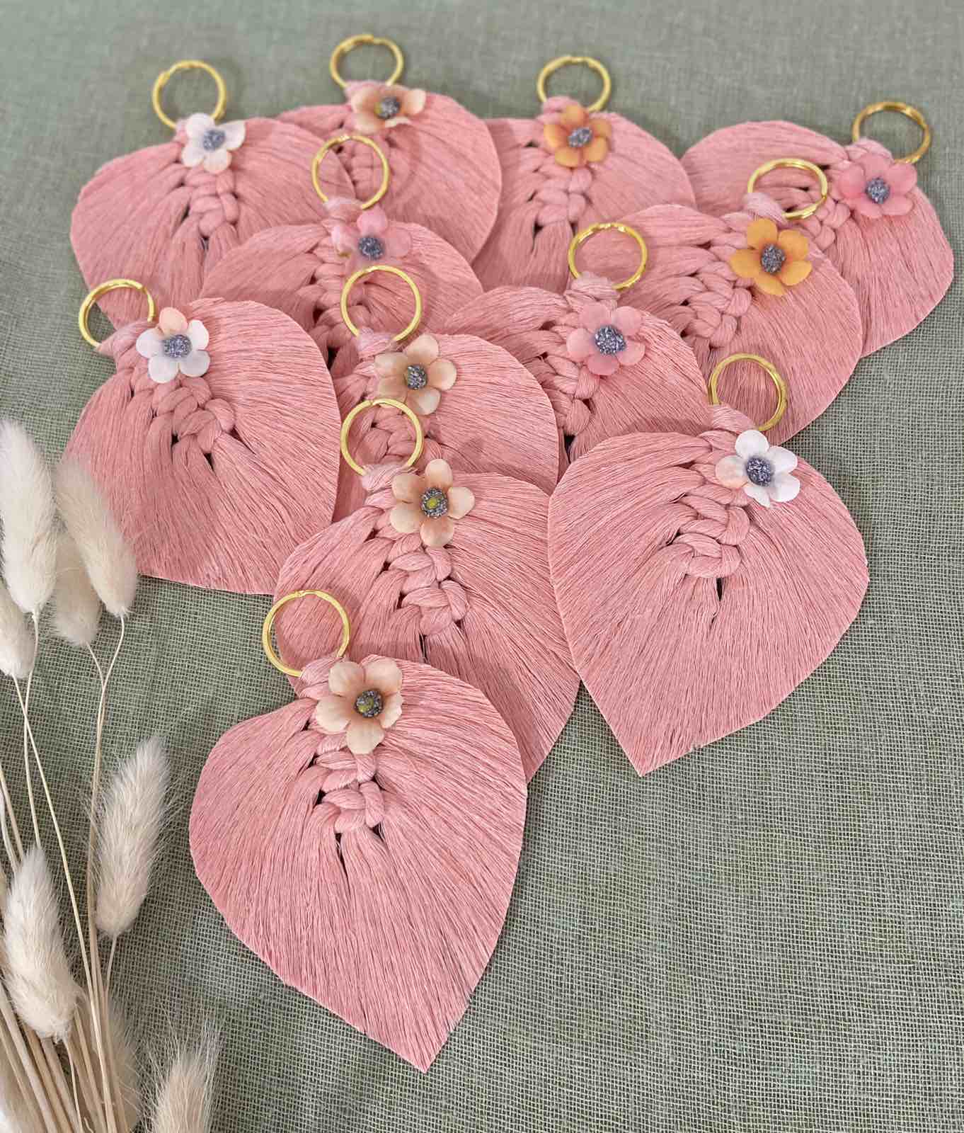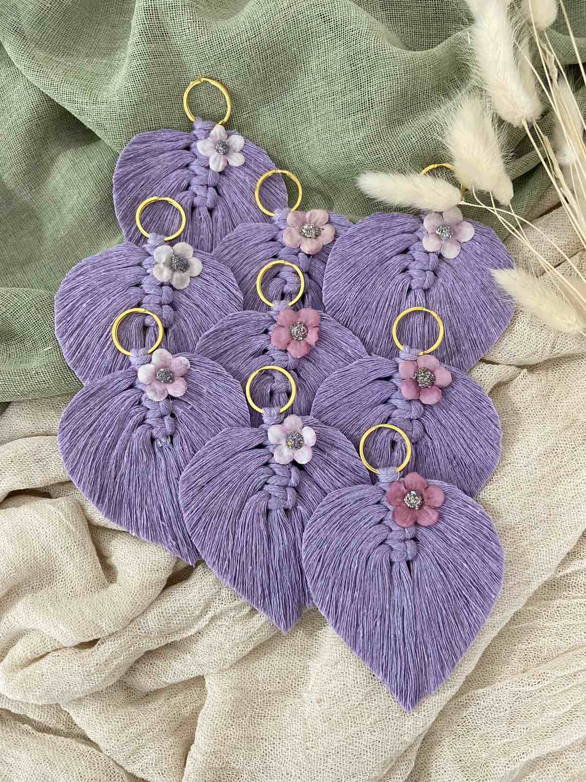 Μπομπονιέρα με θέμα τα λουλουδάκια και τα ζωηρά χρώματα., εμπνευσμένη από τα μακραμέ φύλλα. Μπορεί να γίνει είτε μπρελόκ με κρικάκι, είτε κρεμαστό με σκοινάκι και χαντρούλα.