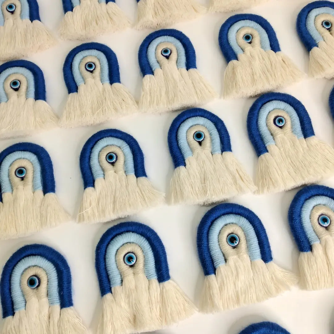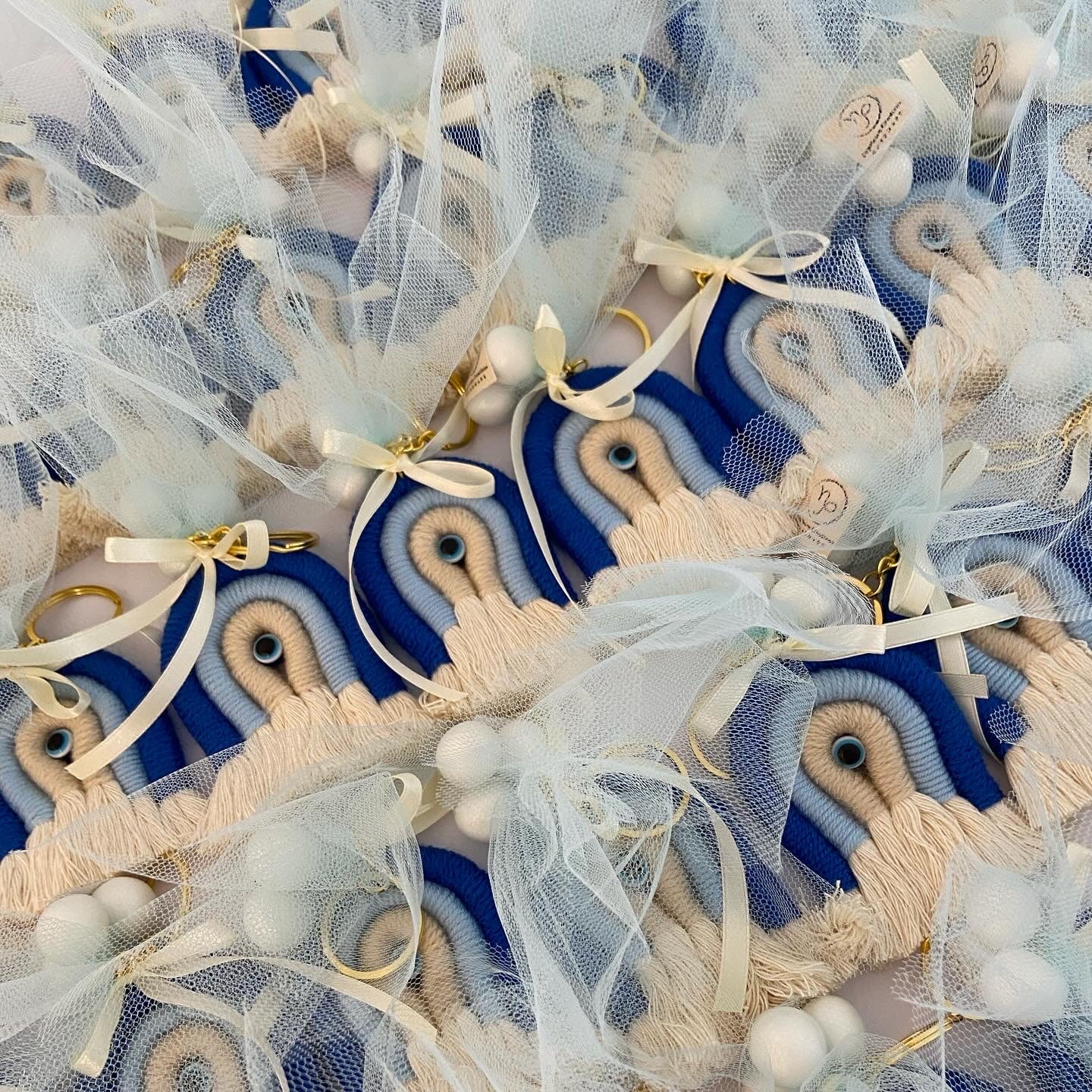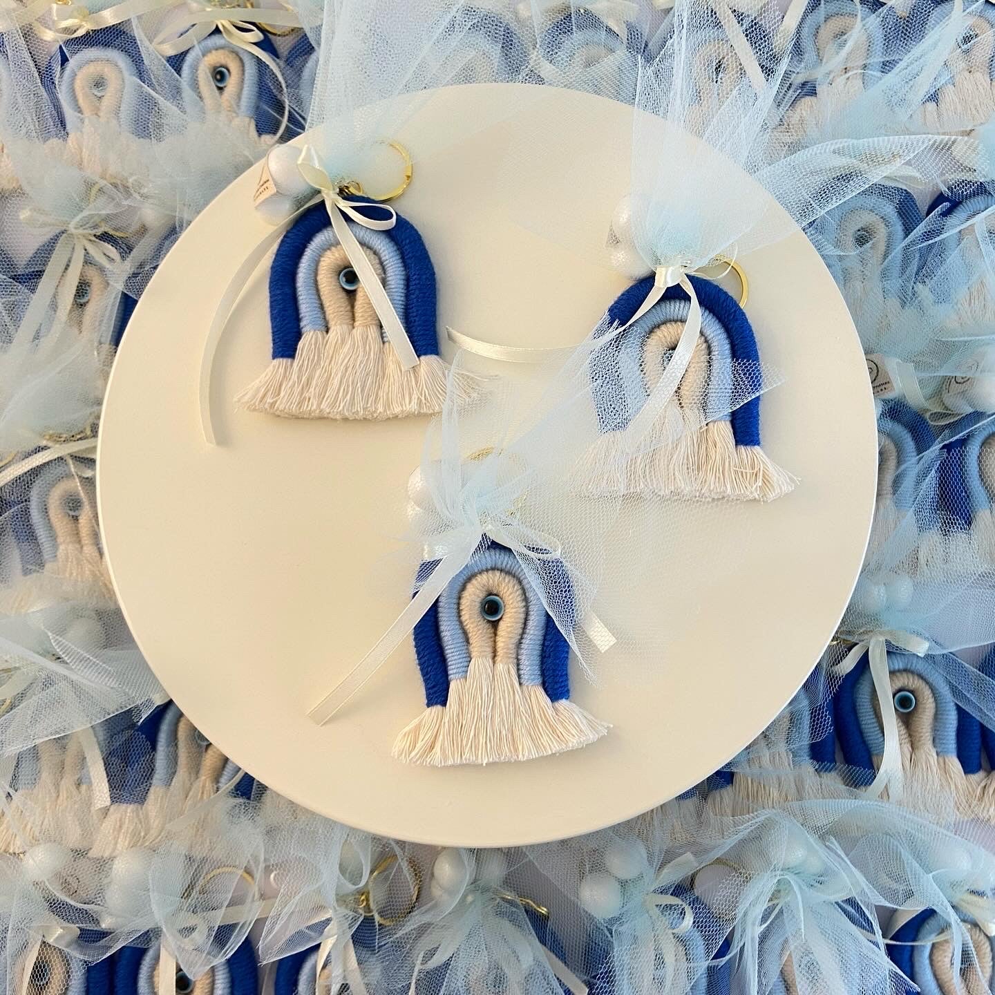 Χειροποίητη μπομπονιέρα ουράνιο τόξο και στο κέντρο διακριτικό ματάκι ως σύμβολο καλής τύχης.