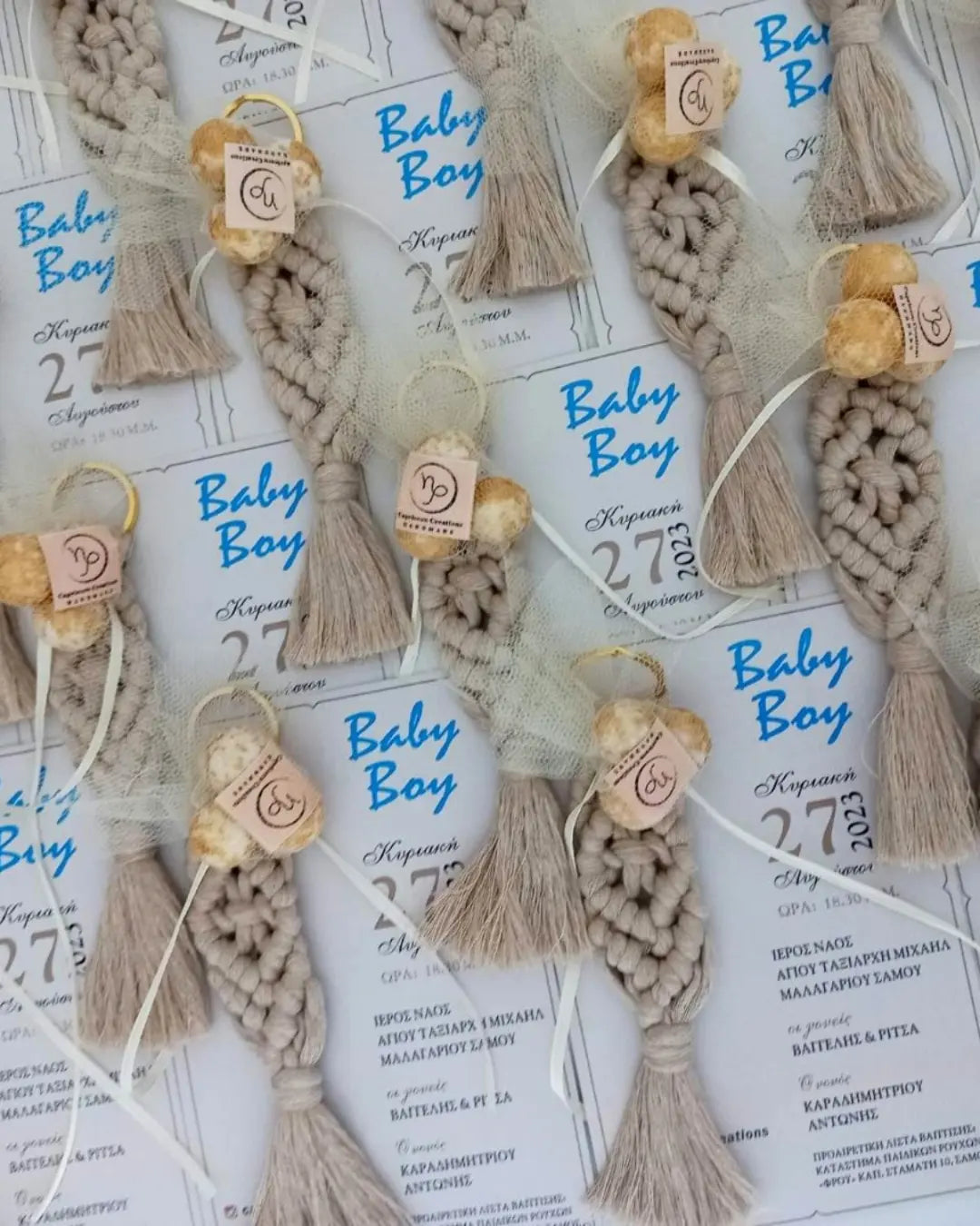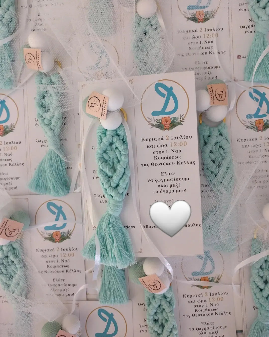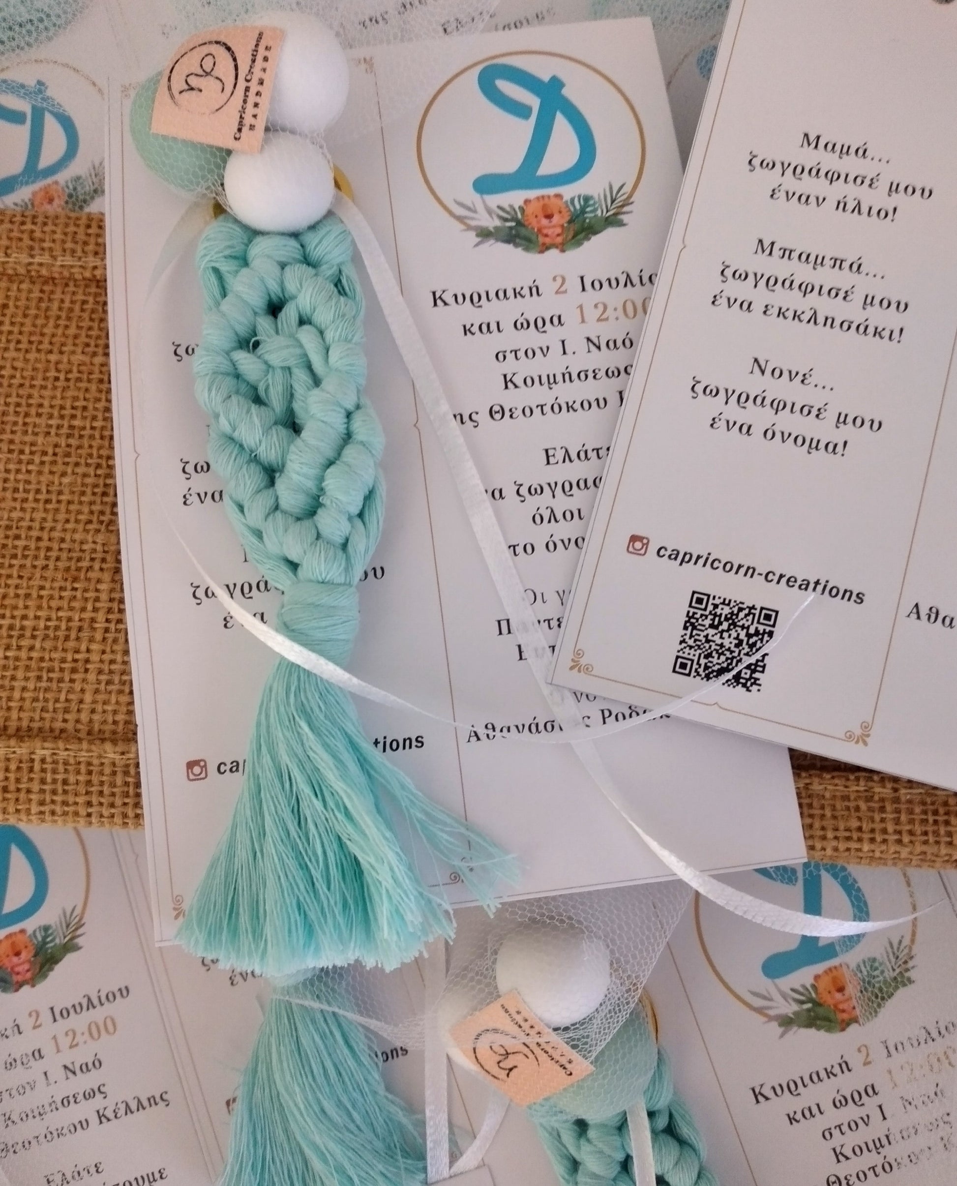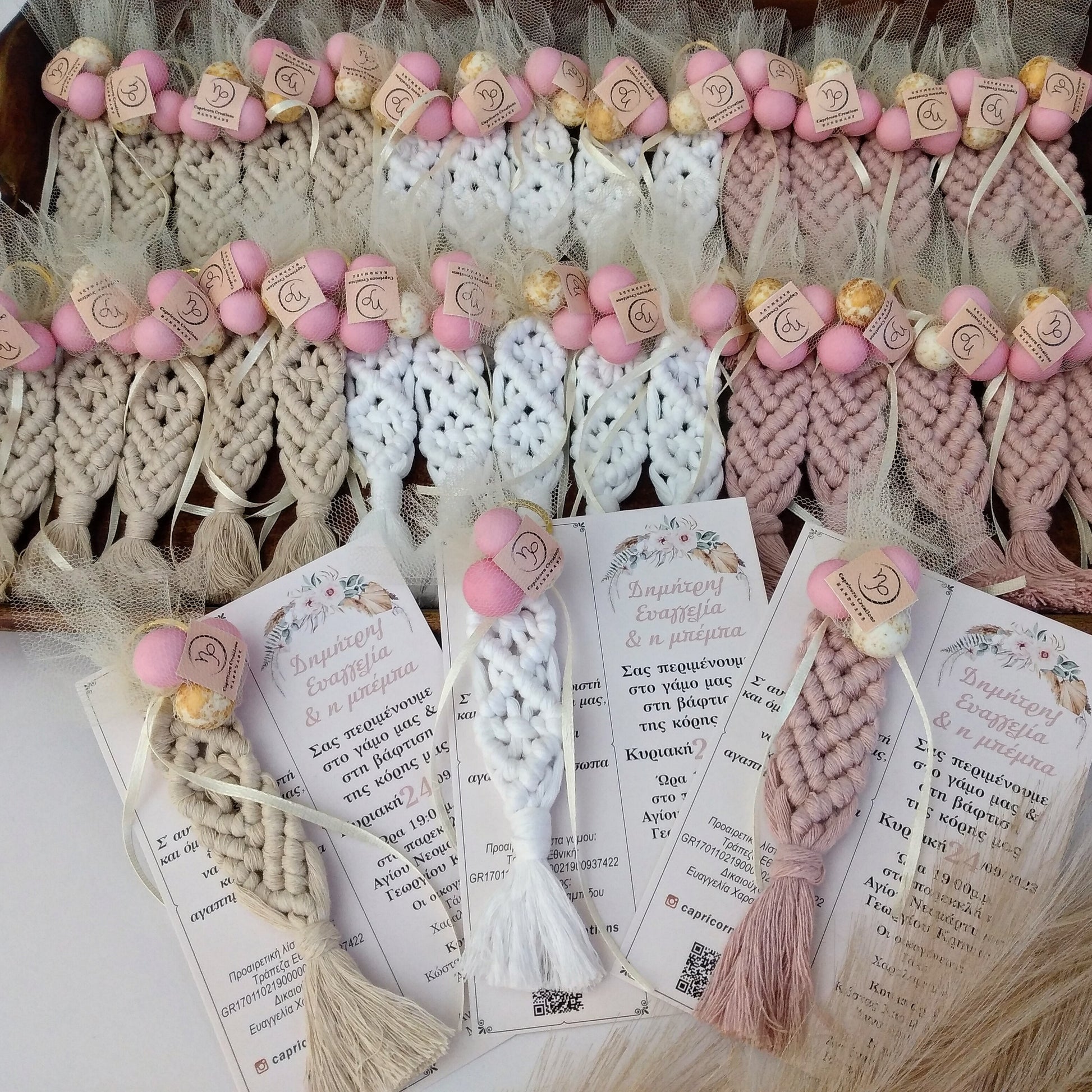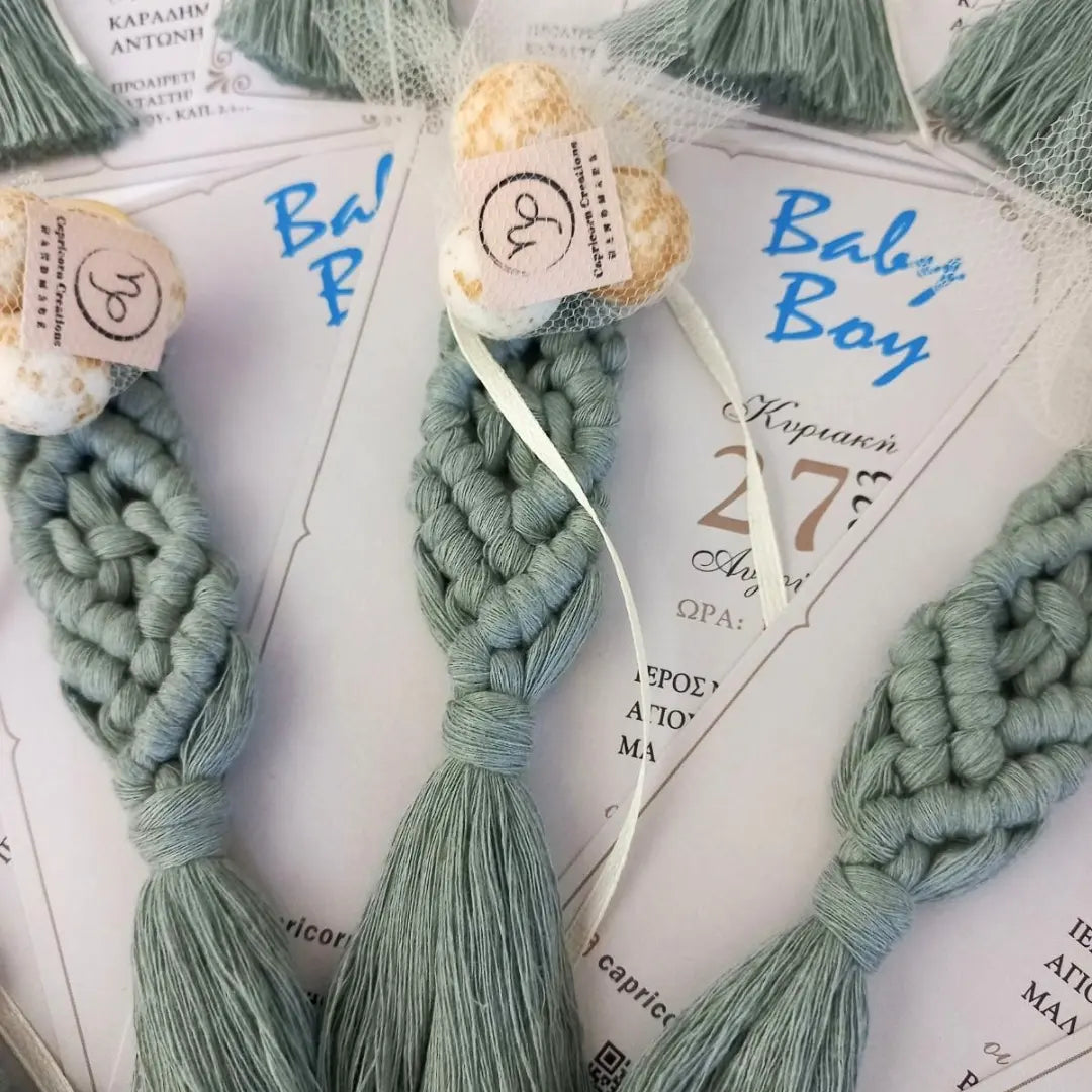 Η τιμή περιλαμβάνει το μακραμέ μπρελόκ μήκους 16 εκατοστών στο χρώμα της αρεσκείας σας, 3 κουφέτα crispy Χατζηγιαννάκη και το προσκλητήριο το οποίο σχεδιάζουμε σύμφωνα με τις επιθυμίες σας.