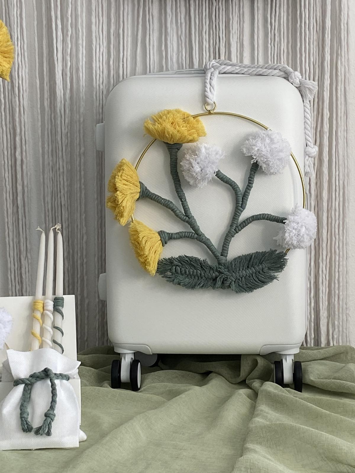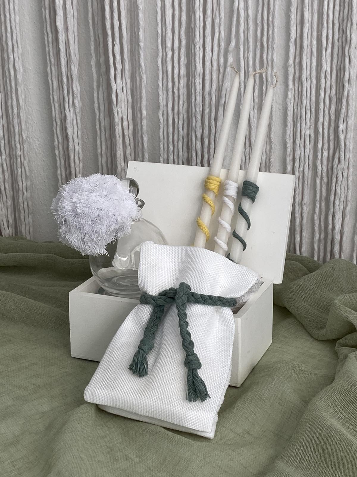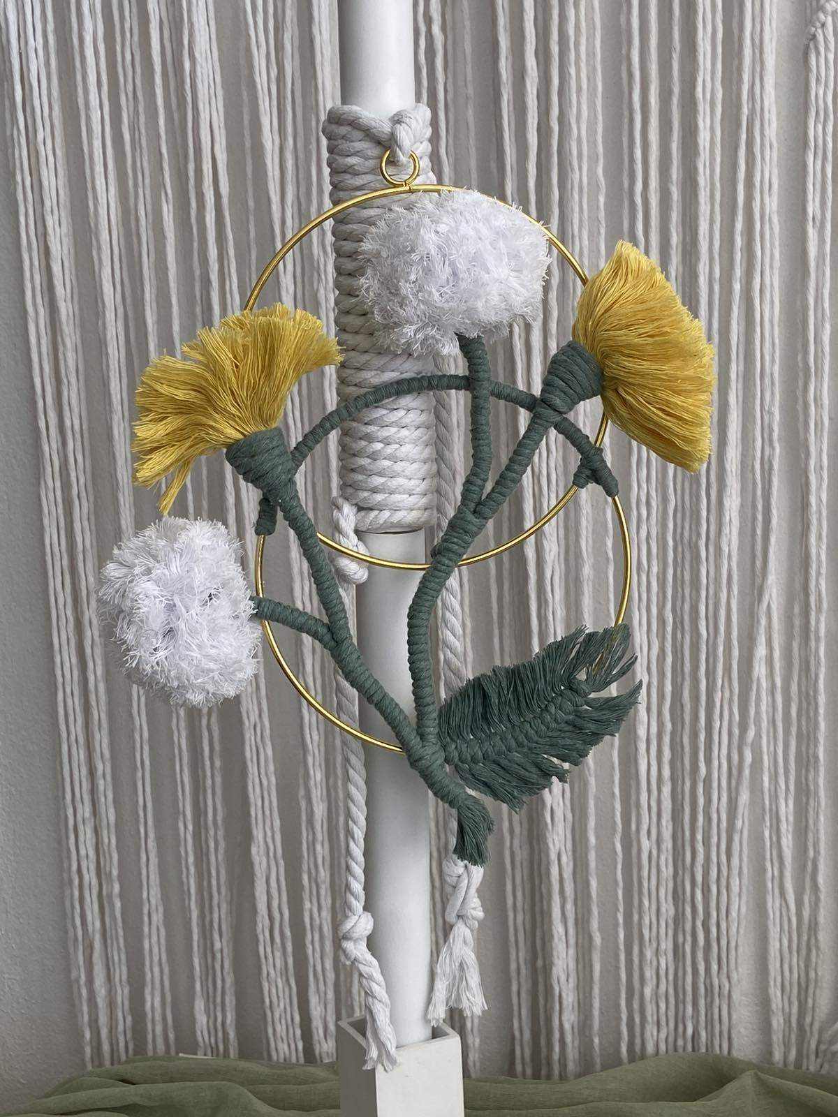 Ένα ξεχωριστό σετ βάπτισης με boho αισθητική, διακοσμημένο με χειροποίητα μακραμέ λουλούδια σε αποχρώσεις του κίτρινου, του λευκού και του λαδί. Ιδανικό για βαπτίσεις με ρομαντική και μοντέρνα διάθεση.