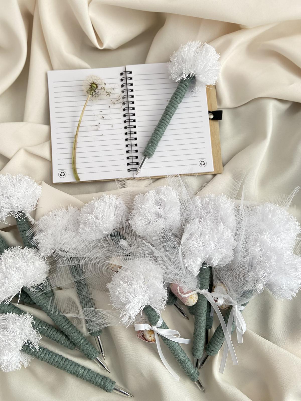 Ανακαλύψτε το πιο ονειρικό στυλό που έχετε δει ποτέ! Κάθε κομμάτι είναι χειροποίητο με τεχνική μακραμέ, ντυμένο σε απαλό γκρι-πράσινο σχοινί και διακοσμημένο με αφράτο λευκό λουλούδι που θυμίζει αγριοράδικο. Μια ρομαντική και boho επιλογή που ξεχωρίζει σε κάθε βάπτιση, γάμο ή εκδήλωση ως μπομπονιέρα ή συμβολικό δώρο. Ιδανικό επίσης για σημειωματάρια καλεσμένων ή guestbook.