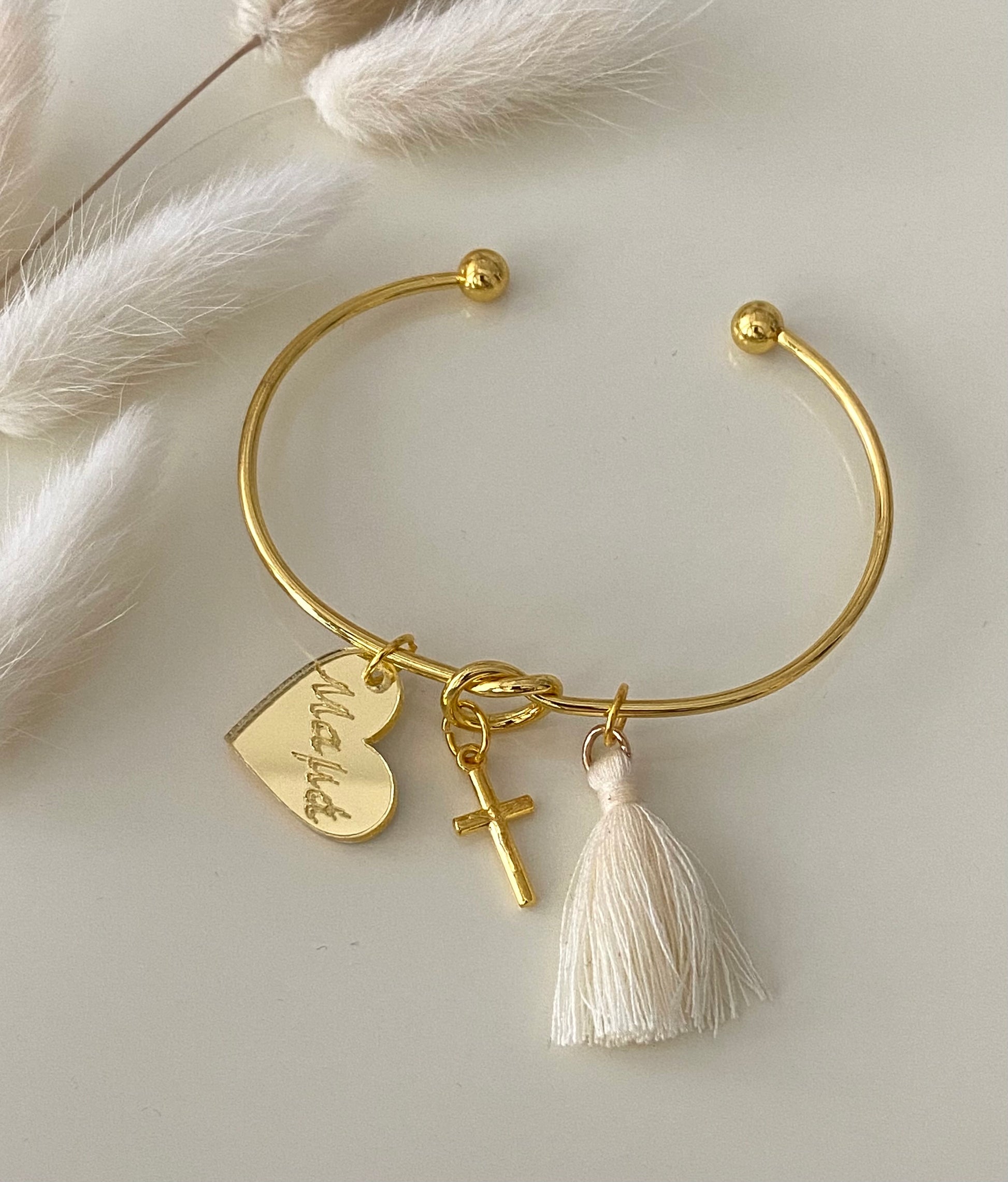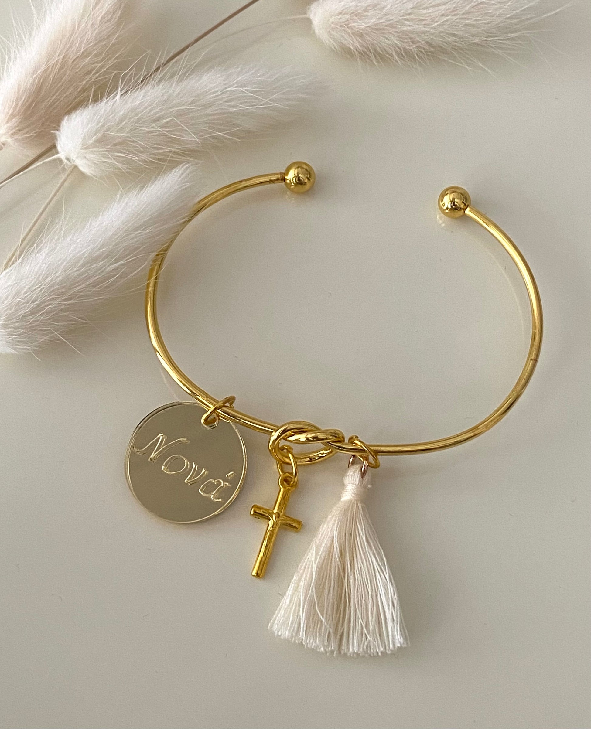 Ιδιαίτερο χρυσό μεταλλικό βραχιόλι κόμπος με λεπτό σταυρό και φουντίτσα στο χρώμα της επιλογής σας. Αυτό που κάνει ιδιαίτερο το κόσμημα είναι οι γλυκιές λεξούλες που είναι χαραγμένες στο χρυσό πλεξιγκλάς!!