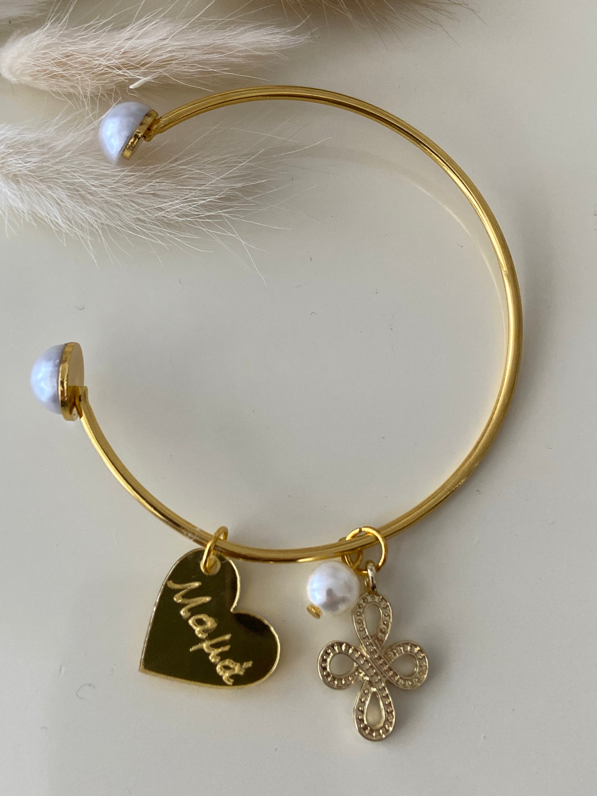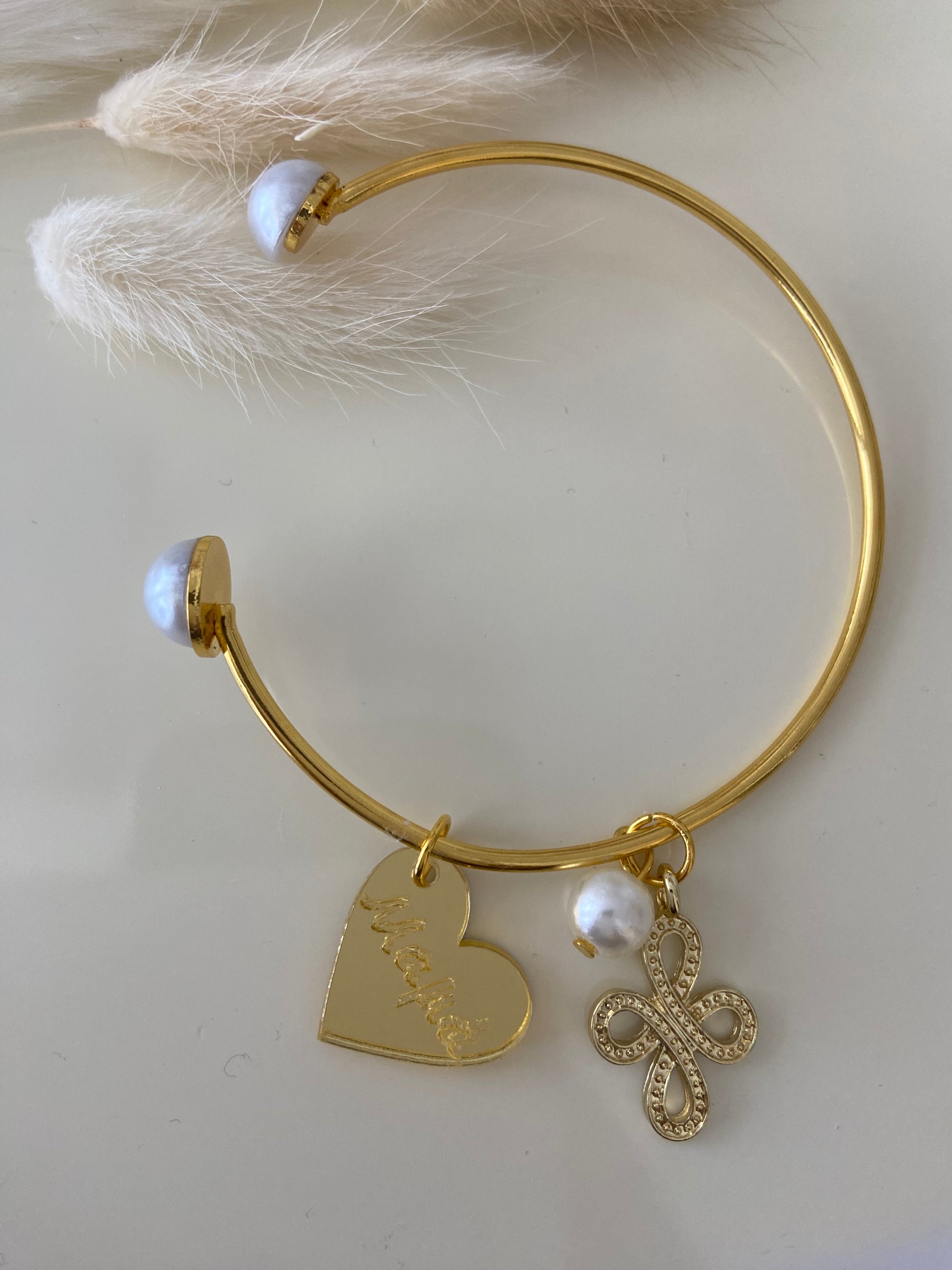 Υπέροχο κόσμημα με πέρλες και ιδιαίτερο σταυρό. Μεγαλύτερη λάμψη και αξία δίνει η γλυκιά λεξούλα που είναι χαραγμένη στην καρδούλα από χρυσό plexiglass.