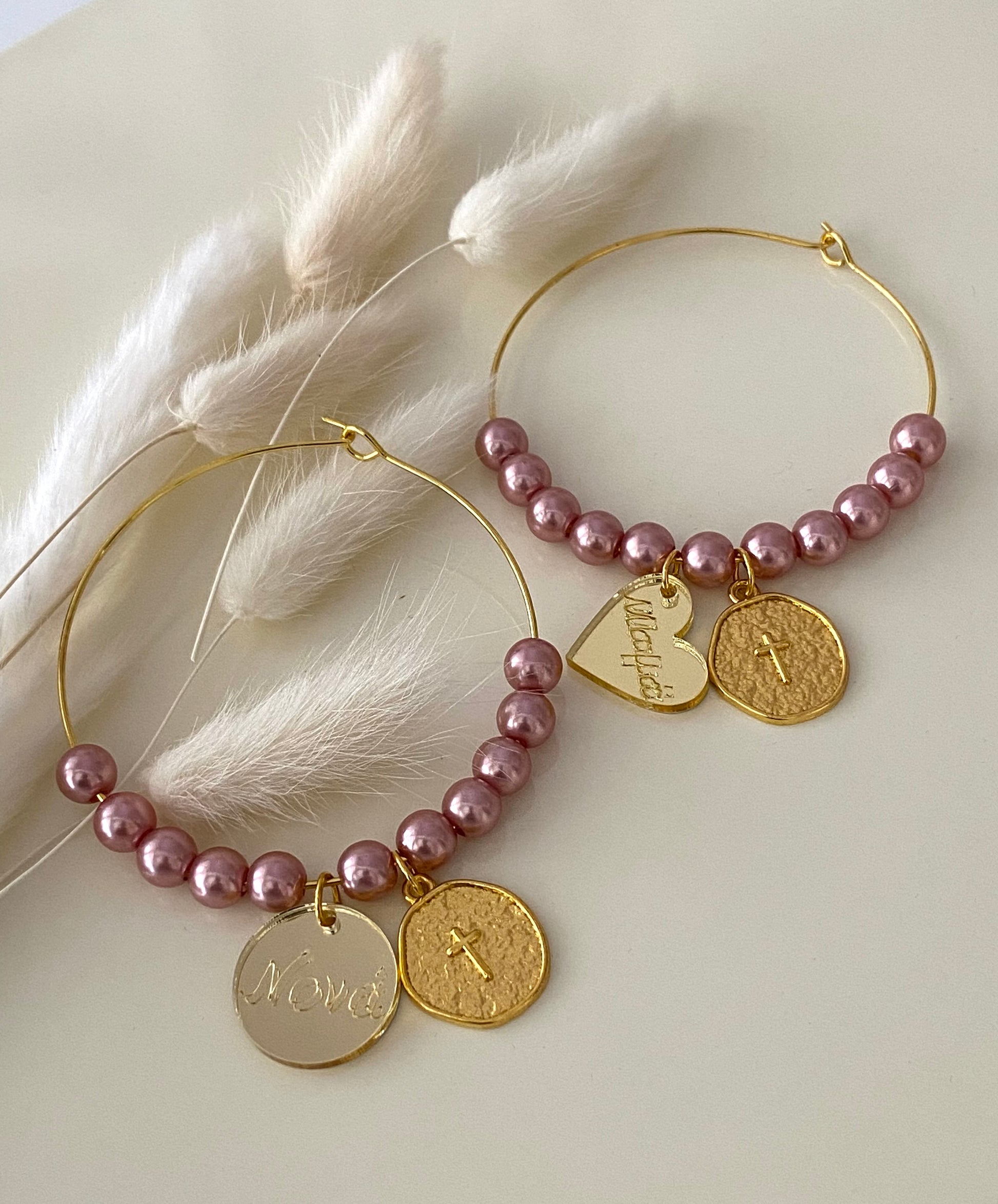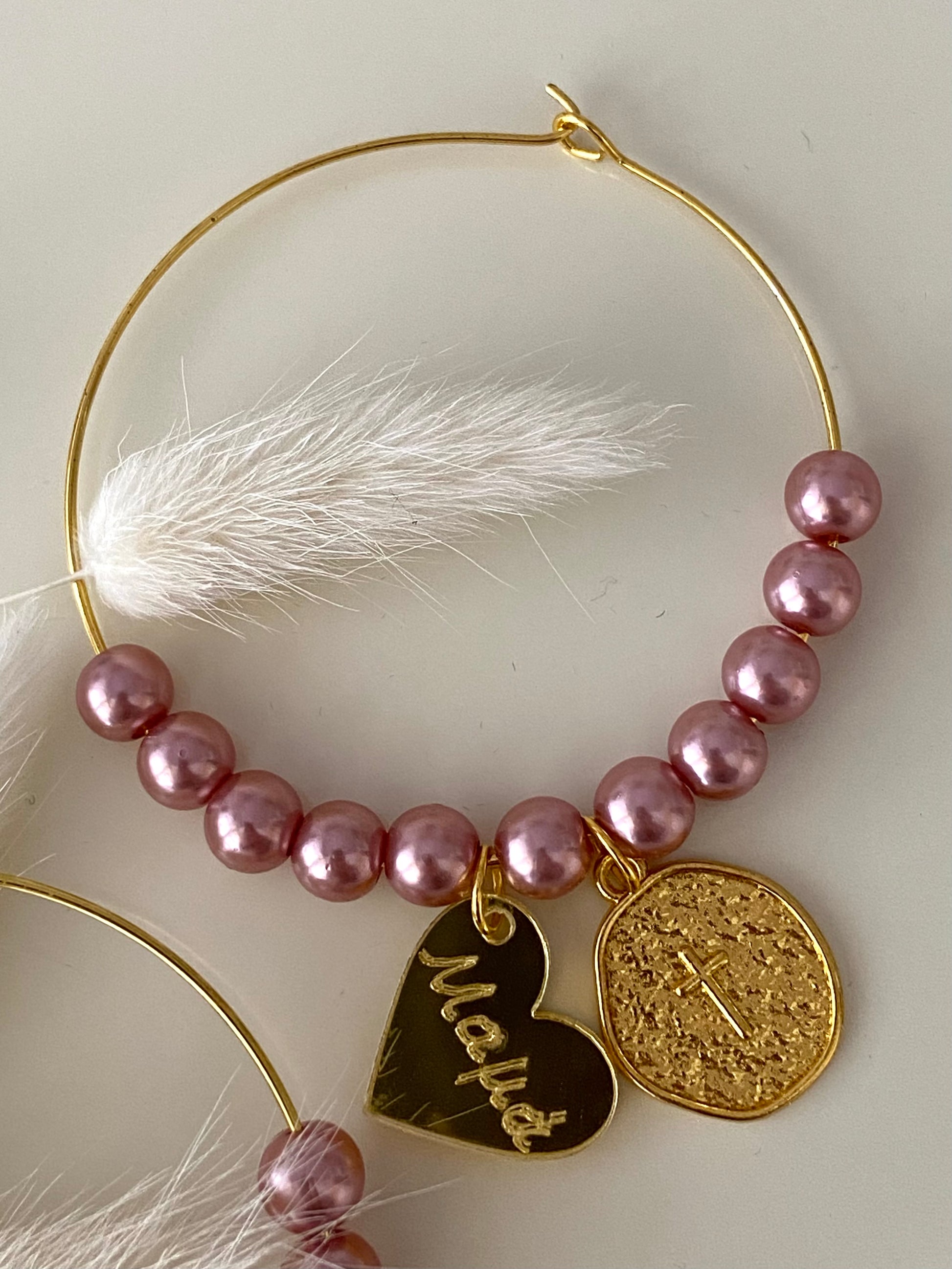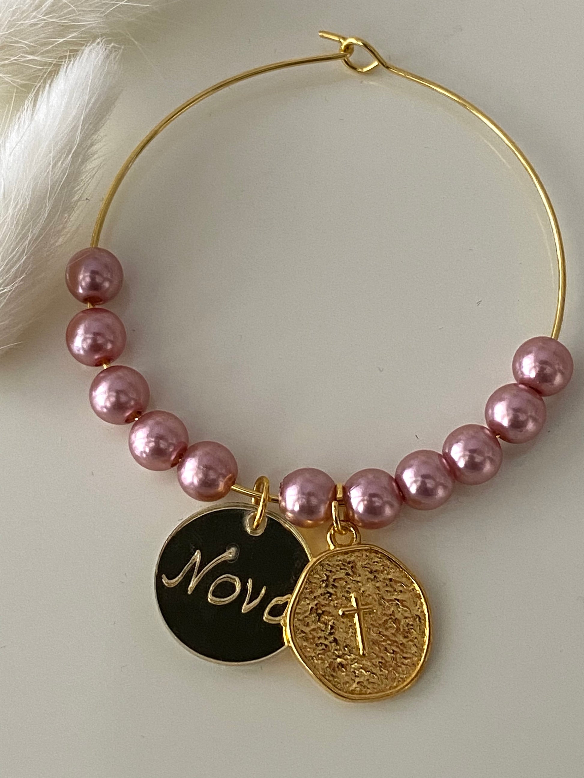 Μαρτυρικό βραχιόλι από λεπτή μεταλλική βέργα με πέρλες και φλουρί με σταυρό.