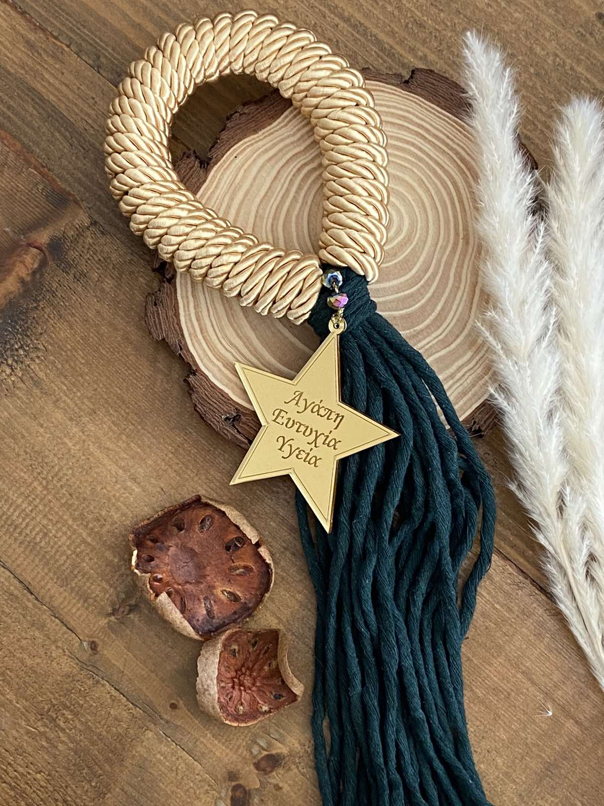 Φέρτε την ευτυχία και τη θετική ενέργεια στο χώρο σας με αυτό το εντυπωσιακό χειροποίητο γούρι. H πολυτελή πλέξη συνδυάζεται αρμονικά με σκούρες πράσινες μακραμέ λεπτομέρειες, ενώ το χρυσό αστέρι φέρει χαραγμένες ευχές για αγάπη, ευτυχία και υγεία. Ιδανικό ως δώρο για το νέο έτος, για φίλους, οικογένεια ή τον εαυτό σας, προσθέτει στυλ και συμβολικότητα σε κάθε σπίτι.